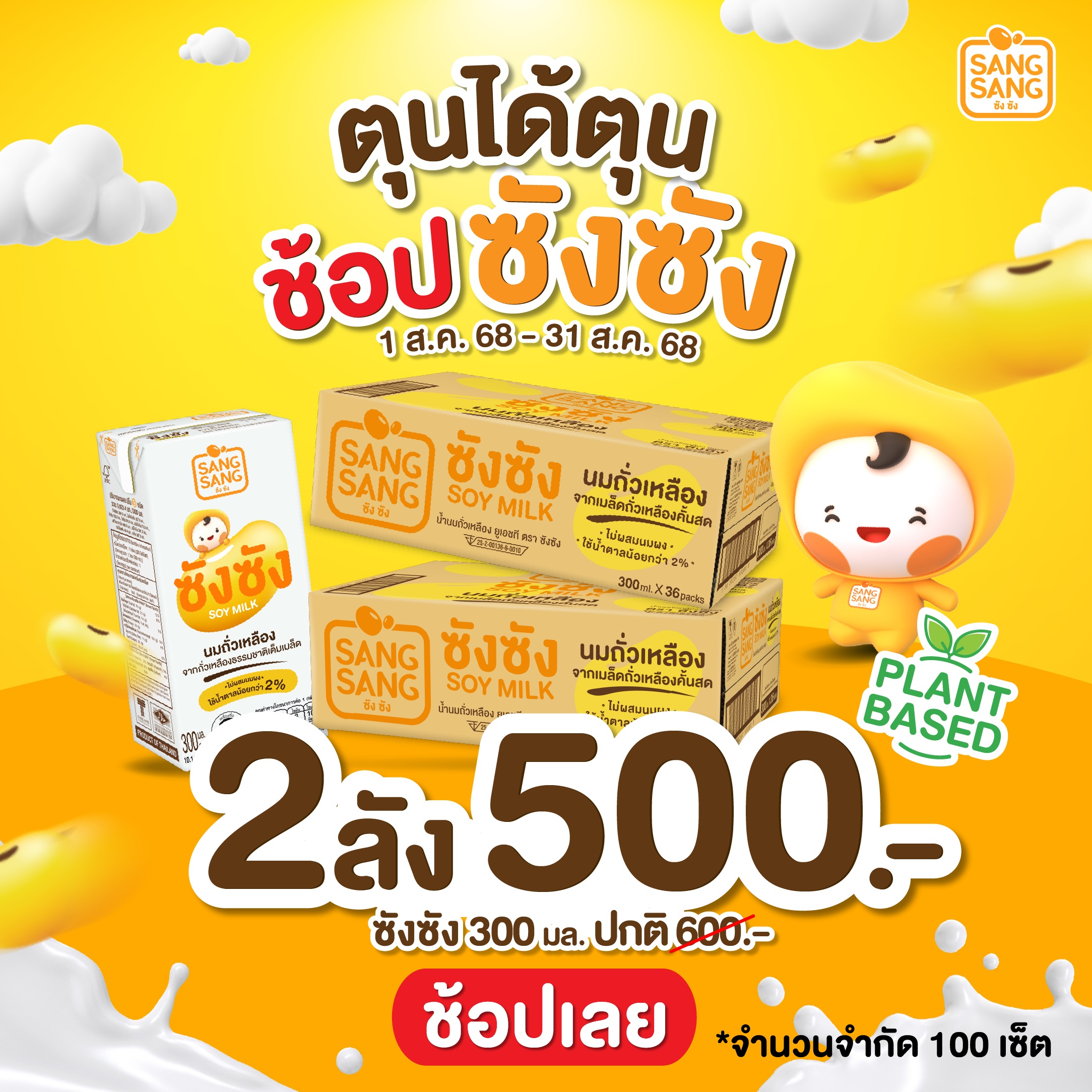 นอกจากนี้ ยังจัดโปรโมชันสุดคุ้มตลอดเดือนสิงหาคม ซังซัง ขนาด 300 มล. จำนวน 2 ลัง เพียง 500 บาท จากราคาปกติ 600 บาท คุ้มจัดหนักแบบนี้ต้องมีซังซังติดบ้านกันแล้ว จำกัด 100 ชุดเท่านั้น ช้าหมดอดตุนรีบไปกดใส่ตะกร้ากันให้ไวที่ https://www.lactasoyshop.com/product/sang-sang-300ml