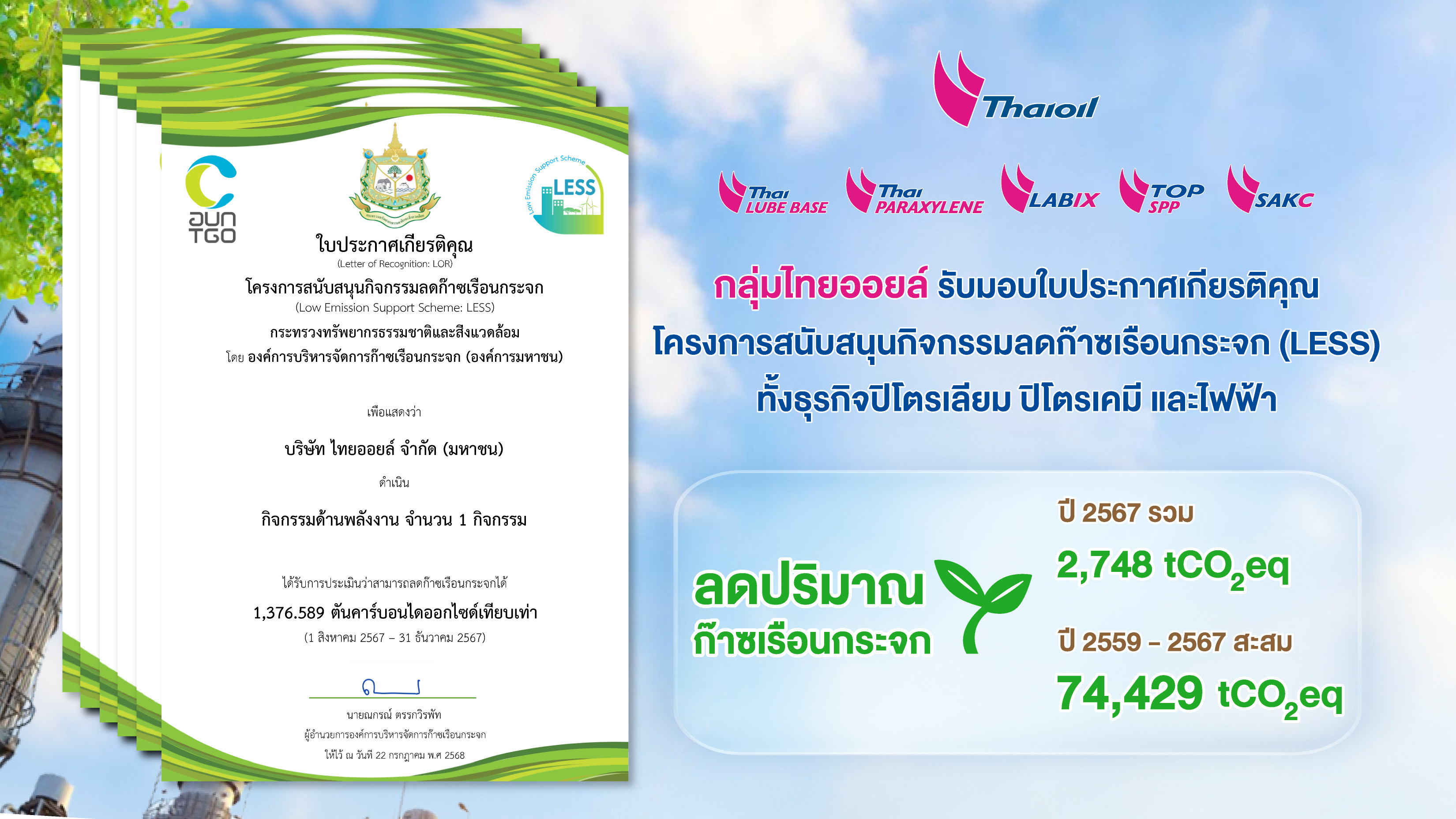 เมื่อเร็วๆ นี้ กลุ่มไทยออยล์ ประกอบด้วยบริษัท ไทยออยล์ จำกัด (มหาชน) บริษัท ไทยลู้บเบส จำกัด (มหาชน) บริษัท ไทยพาราไซลีน จำกัด บริษัท ลาบิกซ์ จำกัด บริษัท บริษัท ท็อป เอสพีพี จำกัด และบริษัท ศักดิ์ไชยสิทธิ จำกัด ได้รับใบประกาศเกียรติคุณโครงการสนับสนุนกิจกรรมลดก๊าซเรือนกระจก (Low Emission Support Scheme : LESS) จากองค์การบริหารก๊าซเรือนกระจก (องค์การมหาชน) ในฐานะผู้ดำเนินกิจกรรมลดก๊าซเรือนกระจกด้วยตนเอง โดยสามารถลดก๊าซเรือนกระจกจากโครงการด้านพลังงานได้ถึง 2,748 ตันคาร์บอนไดออกไซด์เทียบเท่า