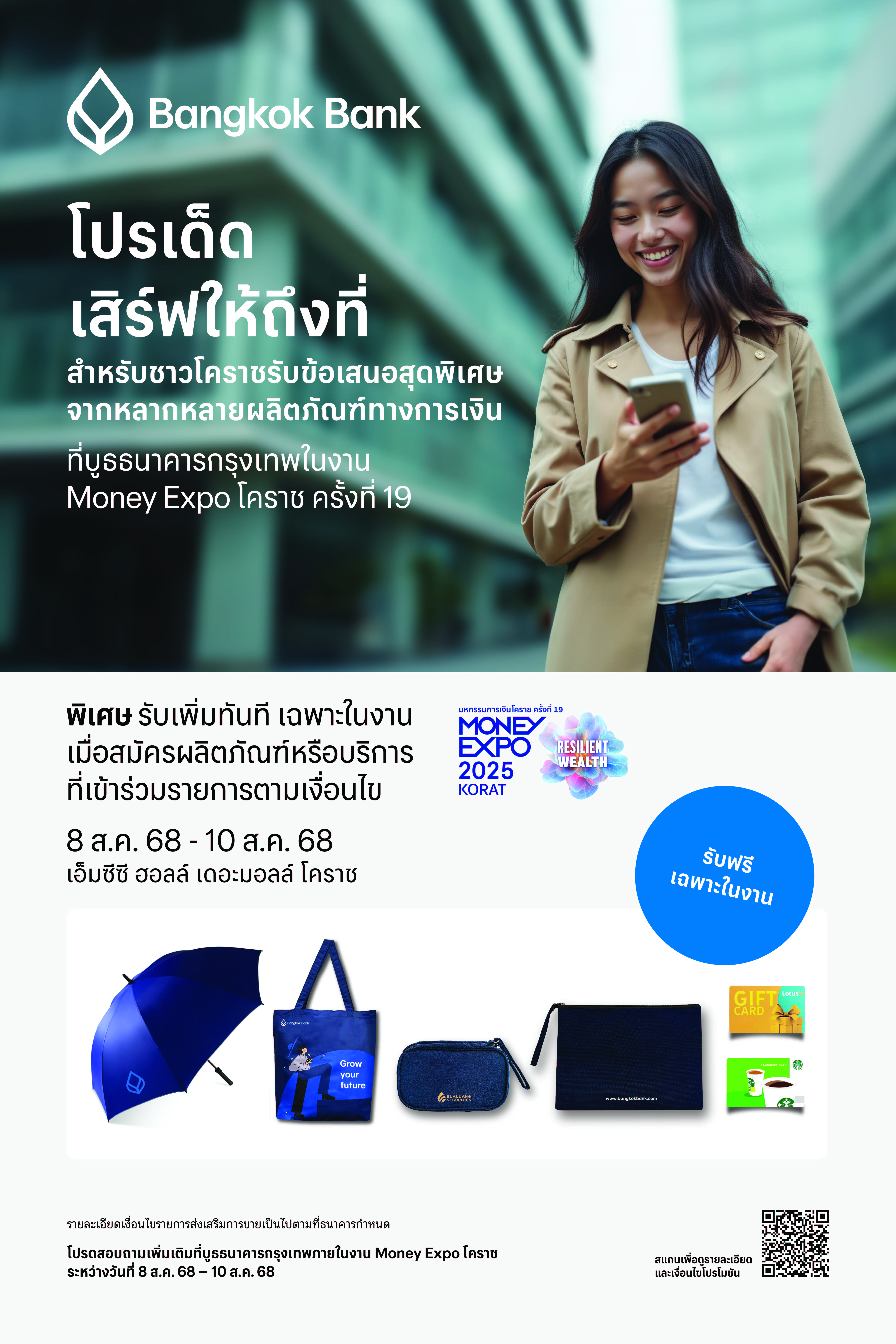 ลูกค้าและผู้ที่สนใจสามารถขอรับคำปรึกษาด้านการเงินและการลงทุนจากเจ้าหน้าที่ผู้เชี่ยวชาญ พร้อมรับโปรโมชันพิเศษได้ที่บูธธนาคารกรุงเทพ ภายในงานมหกรรมการเงินโคราช ครั้งที่ 19 (Money Expo KORAT 2025) ระหว่างวันที่ 8-10 สิงหาคม 2568 ณ เอ็มซีซีฮอลล์ เดอะมอลล์ นครราชสีมา./
