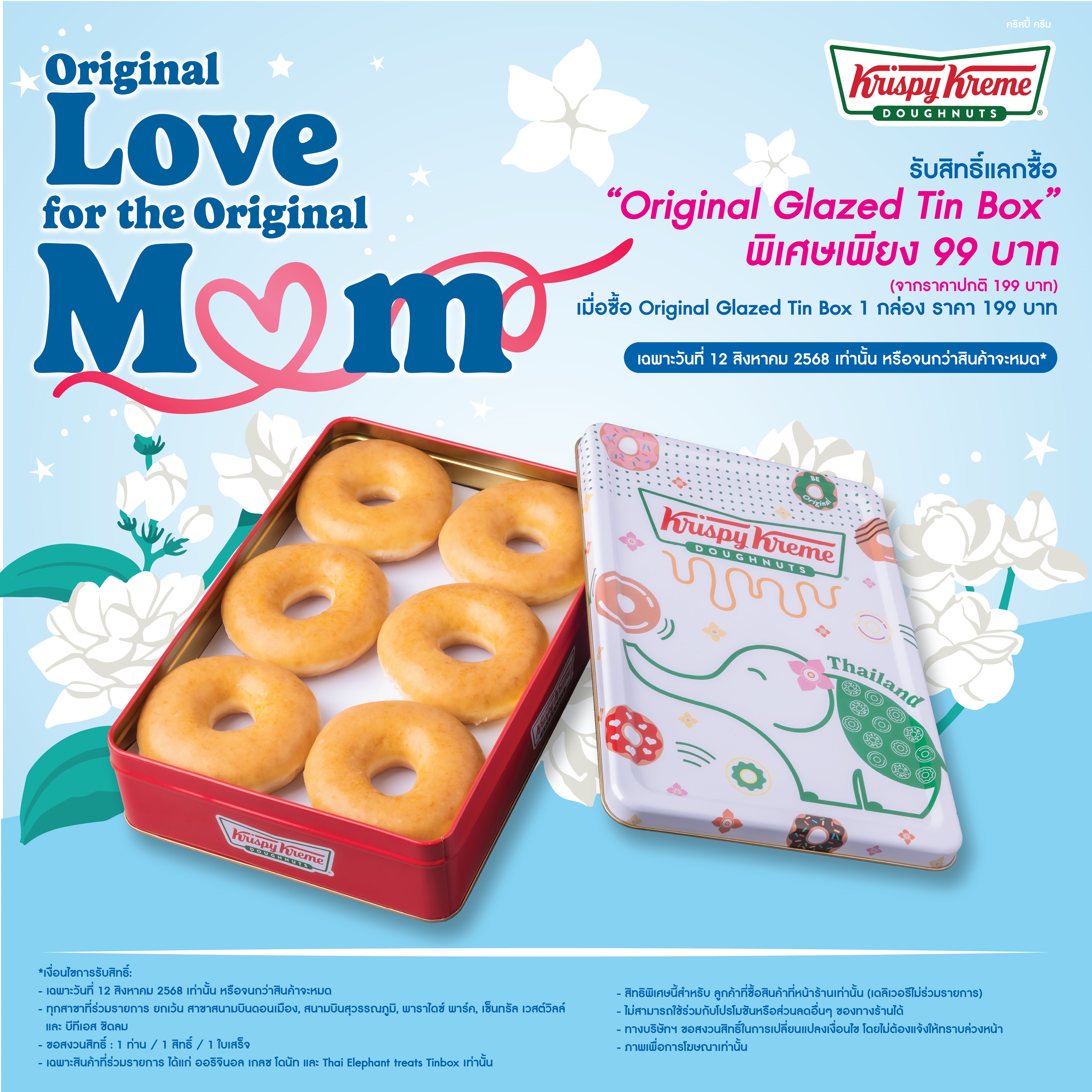 พิเศษสุด!!! เฉพาะวันแม่ปีนี้ (12 สิงหาคม 2568) เพียงซื้อ “คริสปี้ ครีม ช้างน้อย คิวตี้เรด ทินบ็อกซ์ - Original Glazed Set” (Krispy Kreme Thai Elephant treats Tin Box + 6 Original Glazed Set) ในราคา 199 บาท (ราคาดังกล่าว ยกเว้น สาขาสนามบินสุวรรณภูมิ และสนามบินดอนเมือง) ก็รับสิทธิ์แลกซื้อ กล่องที่ 2 ในราคา 99 บาททันที (จำกัด 1 สิทธิ์/ ท่าน/ ใบเสร็จ หรือจนกว่าสินค้าจะหมด) ณ ร้านคริสปี้ ครีม สาขาใกล้บ้านคุณ (ยกเว้น ฟู้ดทรัค) หรือสั่งผ่านแอปพลิเคชันฟู้ดดิลิเวอรีที่ร่วมรายการ พร้อมติดตามความเคลื่อนไหวของ คริสปี้ ครีม โดนัท สุดโปรดของคุณได้ที่