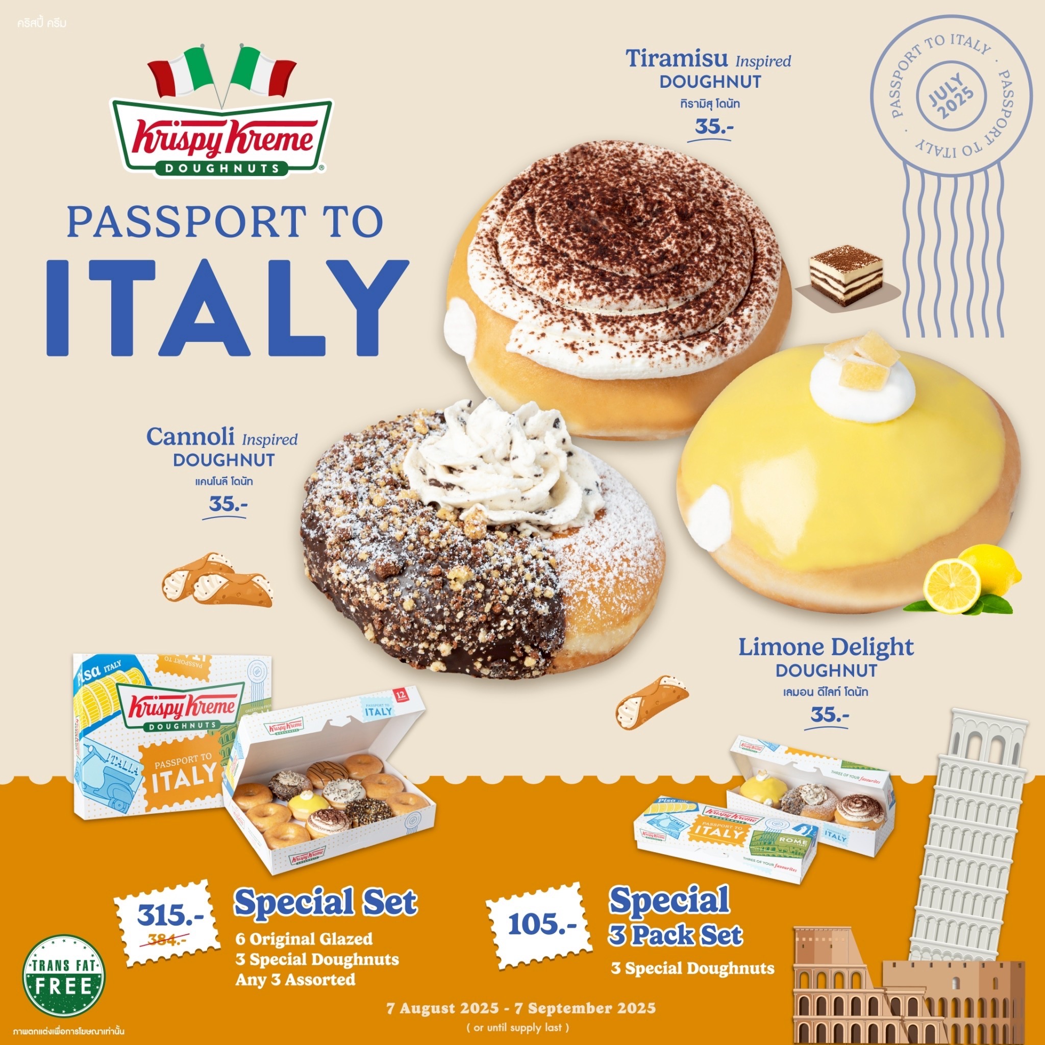 ร่วมสัมผัสเสน่ห์ความอร่อยแบบอิตาลีกับคอลเล็กชัน “Krispy Kreme PASSPORT TO ITALY Doughnuts” ในราคาชิ้นละ 35 บาท หรือจะเลือกซื้อแบบเซตที่มาพร้อมกล่องลายลิมิเต็ดทั้งแบบแพ็ก 3 ในราคา 105 บาท (พาสปอร์ต ทู อิตาลี โดนัท 3 ชิ้น) หรือแบบเซต ในราคาเพียง 315 บาท (พาสปอร์ต ทู อิตาลี โดนัท 3 ชิ้น, แอสซอร์ทเตท 3 ชิ้น และออริจินอล เกลซ 6 ชิ้น) ตั้งแต่วันที่ 7 สิงหาคม – 7 กันยายน 2568 ณ ร้าน คริสปี้ ครีม ทุกสาขาใกล้บ้านคุณ (ราคาดังกล่าว ยกเว้น สาขาสนามบินสุวรรณภูมิ, สนามบินดอนเมือง และแอปพลิเคชัน ฟู้ดดิลิเวอรี)