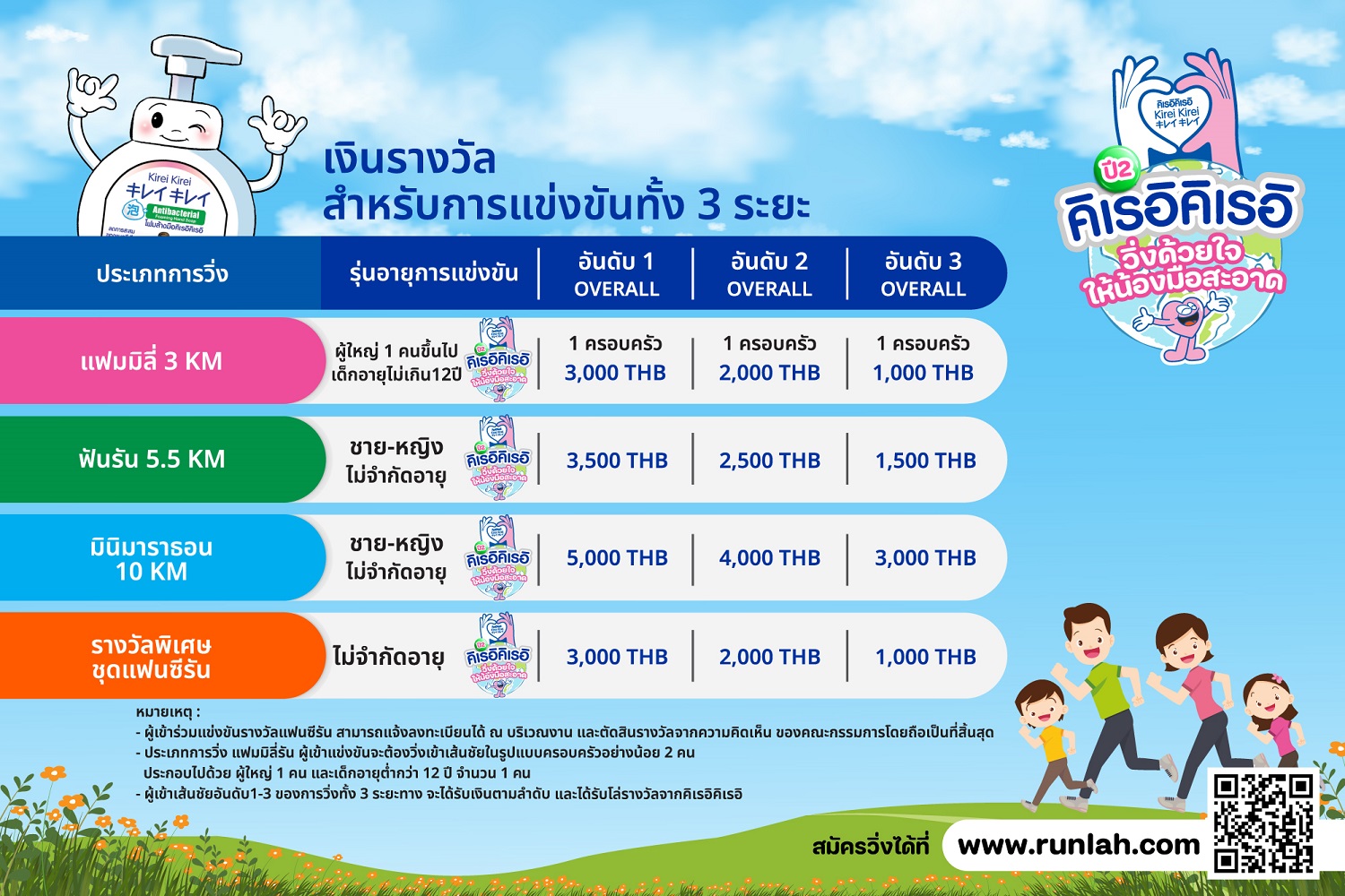 กิจกรรมวิ่งในครั้งนี้ไม่เพียงเป็นการออกกำลังกายเพื่อสุขภาพเท่านั้น แต่ยังเป็นเวทีในการรวมพลังสร้างสังคมและครอบครัวที่แข็งแรงและยั่งยืน ผ่านการรณรงค์ให้เห็นความสำคัญของสุขอนามัยในชีวิตประจำวัน โดยเฉพาะการล้างมืออย่างถูกวิธี โดยจากการสำรวจพฤติกรรมการล้างมือของคนไทยทั่วประเทศที่จัดทำโดยคิเรอิคิเรอิ พบว่ามีคนไทยเพียง 15% เท่านั้นที่ล้างมืออย่างสม่ำเสมอ ดังนั้นคิเรอิจึงจะยังดำเนินการต่อเนื่องในการส่งเสริมพฤติกรรมการล้างมือให้มากขึ้น สำหรับปีนี้ กิจกรรมจัดขึ้นภายใต้แนวคิด “วิ่งด้วยใจให้น้องมือสะอาด” มุ่งปลูกฝังพฤติกรรมการดูแลสุขอนามัยส่วนบุคคลให้แก่เด็กและเยาวชนตั้งแต่วัยเยาว์ ซึ่งเป็นจุดเริ่มต้นสำคัญในการป้องกันโรค และเสริมสร้างคุณภาพชีวิตที่ดีให้กับทั้งครอบครัวและชุมชน กิจกรรมจะมีขึ้นในวันเสาร์ที่ 5 ตุลาคม 2568 ณ สวนสมเด็จพระนางเจ้าสิริกิติ์ฯ และสวนจตุจักร เปิดรับสมัครตั้งแต่วันนี้ ถึงวันที่ 25 กันยายน 2568 โดยแบ่งการวิ่งออกเป็น 4 ประเภท ได้แก่