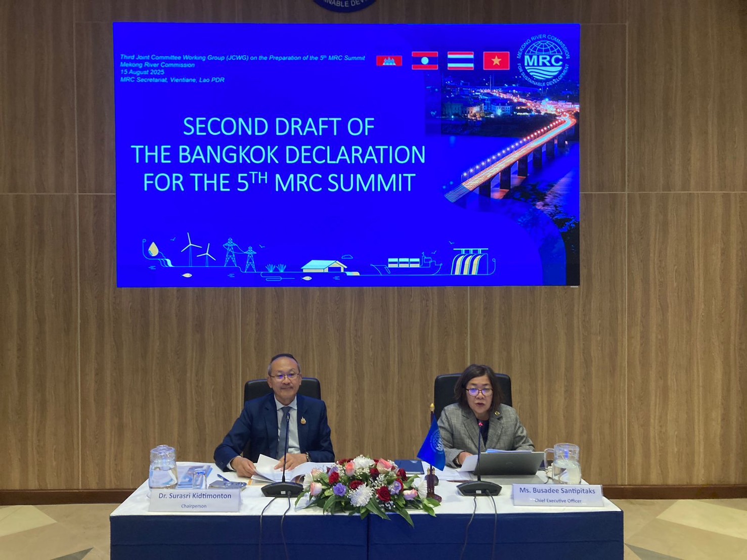 เมื่อวันที่ 15 สิงหาคม 2568 ดร.สุรสีห์ กิตติมณฑล เลขาธิการสำนักงานทรัพยากรน้ำแห่งชาติ (สทนช.) ในฐานะประธานในการประชุมคณะทำงาน ครั้งที่ 3 เพื่อเตรียมการประชุมสุดยอดผู้นำลุ่มน้ำโขงตอนล่าง ครั้งที่ 5 (the 3rd JCWG on the 5th MRC Summit Preparation) โดยมี นางพัชรวีร์ สุวรรณิก รองเลขาธิการ สทนช. นายชุมลาภ เตชะเสน ผู้ช่วยเลขาธิการ สทนช. ดร. วินัย วังพิมูล ผู้อำนวยการกองการต่างประเทศ และผู้แทนจากประเทศสมาชิก เข้าร่วมประชุมฯ ณ สำนักงานเลขาธิการคณะกรรมาธิการแม่น้ำโขง นครหลวงเวียงจันทน์ สาธารณรัฐประชาธิปไตยประชาชนลาว (สปป.ลาว)