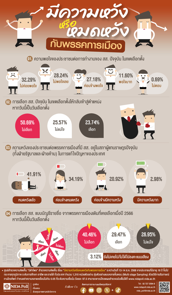 ศูนย์สำรวจความคิดเห็น “นิด้าโพล” สถาบันบัณฑิตพัฒนบริหารศาสตร์ (นิด้า) เปิดเผยผลการสำรวจเรื่อง “มีความหวังหรือหมดหวังกับพรรคการเมือง” ทำการสำรวจระหว่างวันที่ 13-14 สิงหาคม 2568 จากประชาชนที่มีอายุ 18 ปีขึ้นไป กระจายทุกภูมิภาค ระดับการศึกษา อาชีพ และรายได้ ทั่วประเทศ รวมจำนวนทั้งสิ้น 1,310 หน่วยตัวอย่าง เกี่ยวกับการทำงานของสมาชิกสภาผู้แทนราษฎร (สส.) ปัจจุบัน ในเขตเลือกตั้ง การสำรวจอาศัยการสุ่มตัวอย่างโดยใช้ความน่าจะเป็นจากบัญชีรายชื่อฐานข้อมูลตัวอย่างหลัก (Master Sample) ของ “นิด้าโพล” สุ่มตัวอย่างแบบหลายขั้นตอน (Multi-stage Sampling) เก็บข้อมูลด้วยวิธีการสัมภาษณ์ทางโทรศัพท์ โดยกำหนดค่าความคลาดเคลื่อนไม่เกิน 0.05 ที่ระดับความเชื่อมั่น ร้อยละ 97.0