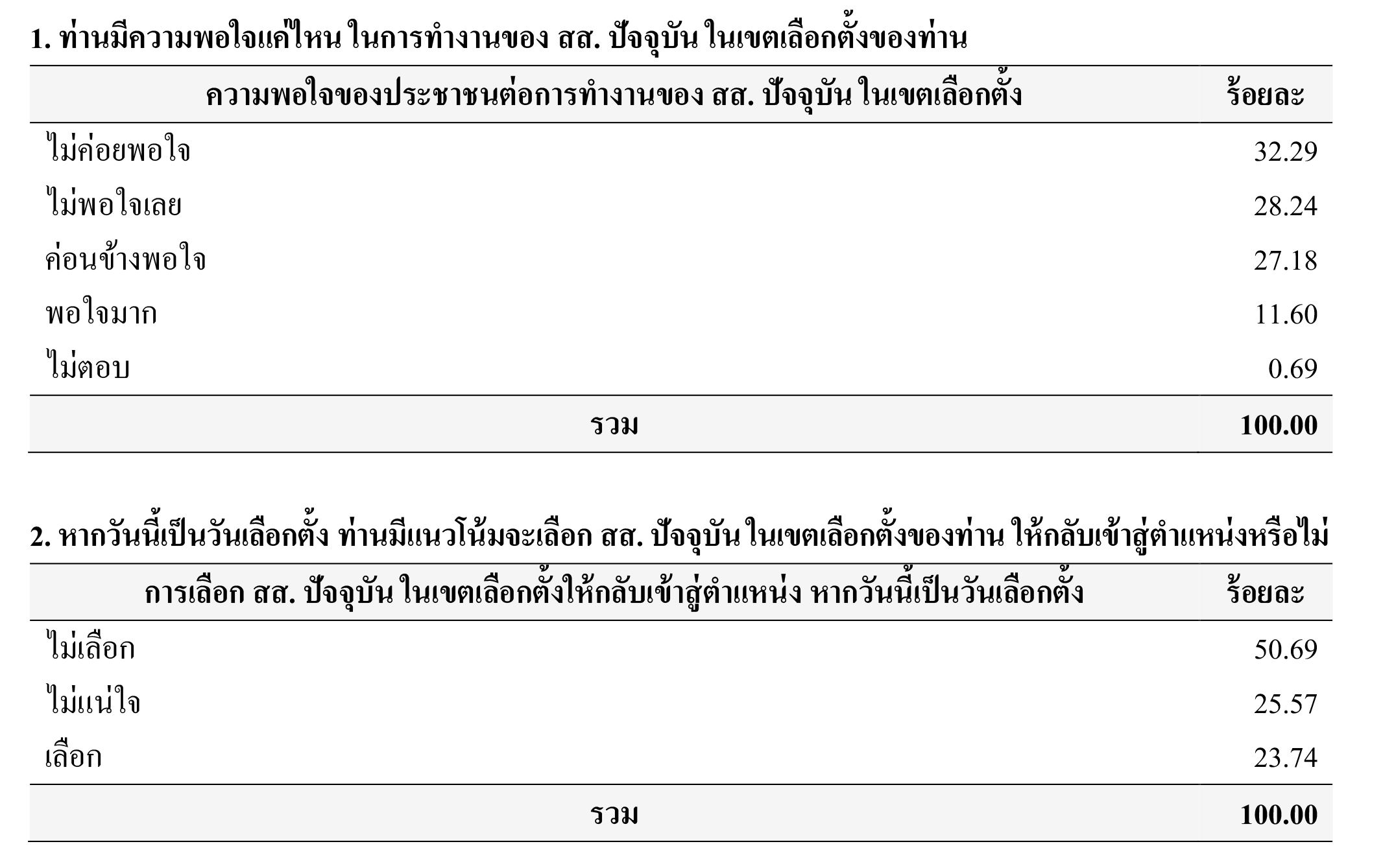 จากการสำรวจเมื่อถามความพอใจของประชาชนต่อการทำงานของ สส. ปัจจุบัน ในเขตเลือกตั้ง พบว่า ตัวอย่าง ร้อยละ 32.29 ระบุว่า ไม่ค่อยพอใจ รองลงมา ร้อยละ 28.24 ระบุว่า ไม่พอใจเลย ร้อยละ 27.18 ระบุว่า ค่อนข้างพอใจ ร้อยละ 11.60 ระบุว่า พอใจมาก และร้อยละ 0.69 ระบุว่า ไม่ตอบ
