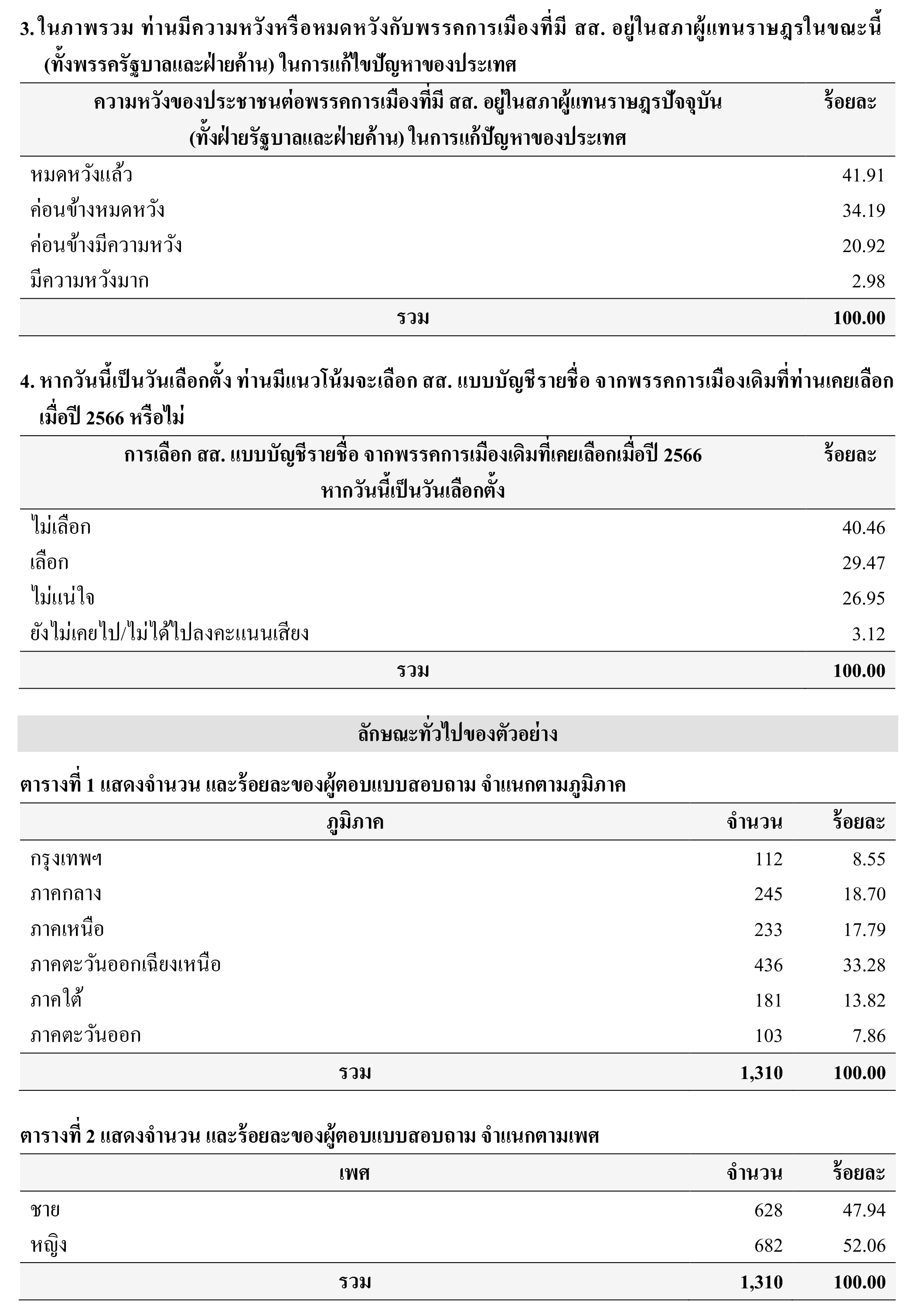 ท้ายที่สุดเมื่อถามถึงการเลือก สส. แบบบัญชีรายชื่อ จากพรรคการเมืองเดิมที่เคยเลือกเมื่อปี 2566 หากวันนี้เป็นวันเลือกตั้ง พบว่า ตัวอย่าง ร้อยละ 40.46 ระบุว่า ไม่เลือก รองลงมา ร้อยละ 29.47 ระบุว่า เลือก ร้อยละ 26.95 ระบุว่า ไม่แน่ใจ และร้อยละ 3.12 ระบุว่า ยังไม่เคยไป/ไม่ได้ไปลงคะแนนเสียง