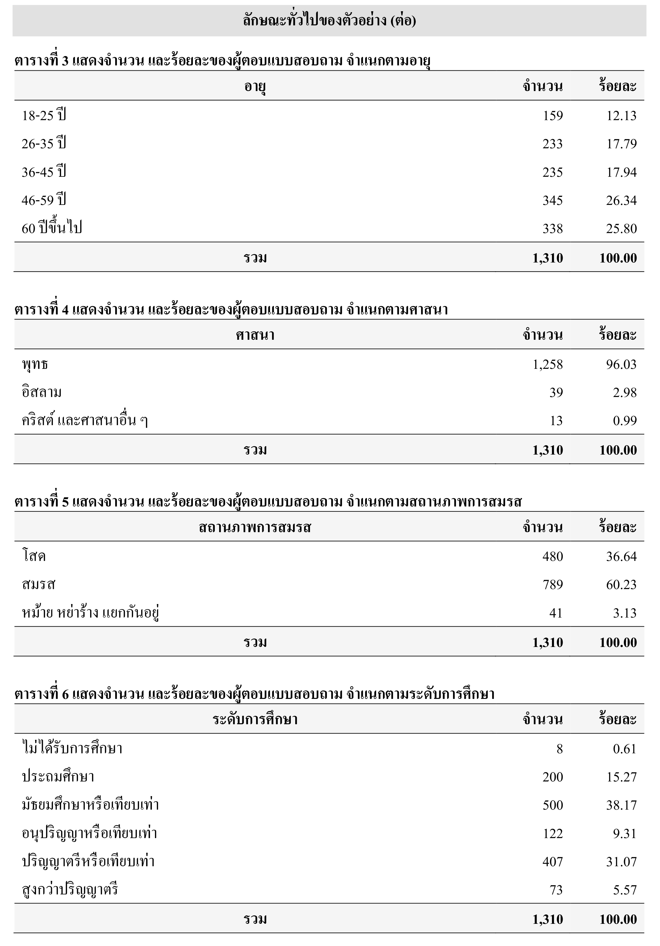 เมื่อพิจารณาลักษณะทั่วไปของตัวอย่าง พบว่า ตัวอย่าง ร้อยละ 8.55 มีภูมิลำเนาอยู่กรุงเทพฯ ร้อยละ 18.70 มีภูมิลำเนาอยู่ภาคกลาง ร้อยละ 17.79 มีภูมิลำเนาอยู่ภาคเหนือ ร้อยละ 33.28 มีภูมิลำเนาอยู่ภาคตะวันออกเฉียงเหนือ ร้อยละ 13.82 มีภูมิลำเนาอยู่ภาคใต้ และร้อยละ 7.86 มีภูมิลำเนาอยู่ภาคตะวันออก โดยตัวอย่าง ร้อยละ 47.94 เป็นเพศชาย และร้อยละ 52.06 เป็นเพศหญิง ตัวอย่าง ร้อยละ 12.13 อายุ 18-25 ปี ร้อยละ 17.79 อายุ 26-35 ปี ร้อยละ 17.94 อายุ 36-45 ปี ร้อยละ 26.34 อายุ 46-59 ปี และร้อยละ 25.80 อายุ 60 ปีขึ้นไป โดยตัวอย่าง ร้อยละ 96.03 นับถือศาสนาพุทธ ร้อยละ 2.98 นับถือศาสนาอิสลาม และร้อยละ 0.99 นับถือศาสนาคริสต์ และศาสนาอื่น ๆ