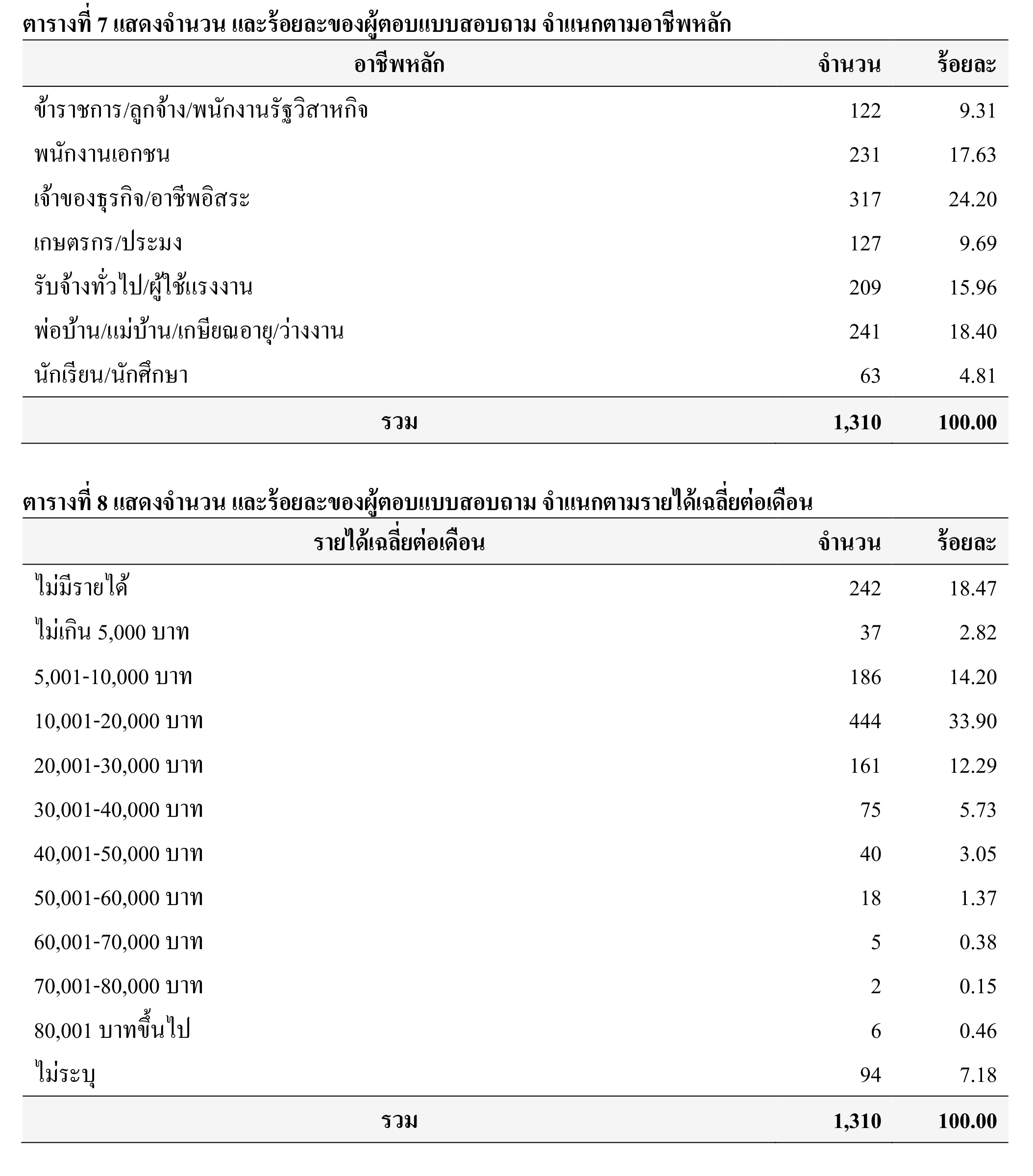 ตัวอย่าง ร้อยละ 9.31 ประกอบอาชีพข้าราชการ/ลูกจ้าง/พนักงานรัฐวิสาหกิจ ร้อยละ 17.63 ประกอบอาชีพพนักงานเอกชน ร้อยละ 24.20 ประกอบอาชีพเจ้าของธุรกิจ/อาชีพอิสระ ร้อยละ 9.69 ประกอบอาชีพเกษตรกร/ประมง ร้อยละ 15.96 ประกอบอาชีพรับจ้างทั่วไป/ผู้ใช้แรงงาน ร้อยละ 18.40 เป็นพ่อบ้าน/แม่บ้าน/เกษียณอายุ/ว่างงาน และร้อยละ 4.81 เป็นนักเรียน/นักศึกษา