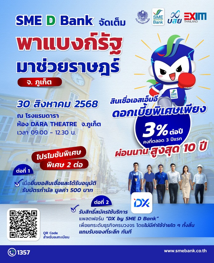 ธนาคารพัฒนาวิสาหกิจขนาดกลางและขนาดย่อมแห่งประเทศไทย (ธพว.) หรือ SME D Bank ขับเคลื่อนนโยบายรัฐ เดินหน้ากระตุ้นเศรษฐกิจในประเทศ ยกขบวนบริการ “พัฒนาคู่เติมทุน” เสิร์ฟผู้ประกอบการเอสเอ็มอีพื้นที่ภาคใต้ ในงาน “พาแบงก์รัฐ มาช่วยราษฎร์” ในวันที่ 30 สิงหาคม 2568 เวลา 09.00-12.30 น. ณ โรงแรมดารา จ.ภูเก็ต ภายในงานพบบริการสินเชื่อเพื่อเอสเอ็มอี อัตราดอกเบี้ยพิเศษเพียง 3% ต่อปี คงที่ตลอด 3 ปีแรก ผ่อนชำระนานสูงสุด 10 ปี ครอบคลุมทุกกลุ่มธุรกิจและทุกความต้องการของเอสเอ็มอี พร้อมทีมให้คำปรึกษา ยื่นกู้ได้ทันทีภายในงาน อีกทั้ง รับโปรโมชันเสริมพิเศษ อีก 2 ต่อ ได้แก่ ต่อที่ 1 เมื่อยื่นขอสินเชื่อและได้รับอนุมัติ รับบัตรกำนัล มูลค่า 500 บาท และ ต่อที่ 2 รับสิทธิ์สมัครใช้บริการแพลตฟอร์ม “DX by SME D Bank” เพื่อยกระดับธุรกิจครบวงจร ฟรี! ห้ามพลาด ขอเชิญผู้ประกอบการ จ.ภูเก็ต และใกล้เคียง เข้าร่วมงานโดยไม่มีค่าใช้จ่ายใด ๆ ทั้งสิ้น ลงทะเบียนเข้าร่วมโดยสแกน QR Code ในโปสเตอร์ประชาสัมพันธ์ สอบถามข้อมูลเพิ่มเติม Call Center 1357