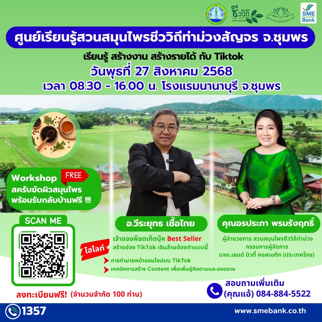 นอกจากนี้ ยังมี เวิร์กชอปสครับขัดผิวสมุนไพร ฟรี ให้ผู้เข้าร่วมได้ฝึกปฏิบัติจริง พร้อมรับผลิตภัณฑ์กลับบ้าน และการบรรยายพิเศษ การเข้าถึงสินเชื่อดอกเบี้ยต่ำ จาก SME D Bank เพื่อเป็นแหล่งทุนสนับสนุนการขยาย ปรับปรุงกิจการ หรือเสริมสภาพคล่องทางธุรกิจ