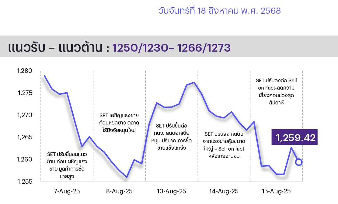 ช่วงสั้นมอง SET มีโอกาสพักฐาน หลังดัชนีปรับขึ้นต่อเนื่องจนเข้าใกล้แนวต้านสำคัญที่ 1280/1300 จุด ซึ่งคาดได้สะท้อนถึงแรงหนุนจาก Fund Flow ที่ไหลเข้าและการปรับลดดอกเบี้ยนโยบายของ กนง. ไปแล้วในระดับหนึ่ง สัปดาห์นี้คาดตัวเลข GDP 2Q68 และการส่งออกไทยจะออกมาดีกว่าตลาดคาดเช่นเดียวกับที่เกิดขึ้นในช่วงก่อนหน้า ส่วนประเด็นการเมืองที่เกี่ยวกับคดีของอดีตนายกฯ ทักษิณมองไม่มีนัยยะกับตลาด แต่ต้องจับตา ป.ป.ช. ว่าจะมีมติส่งคดีตามมาตรา 144 ซึ่งเกี่ยวกับการโยกงบประมาณไปใช้ในโครงการ Digital Wallet ให้ศาล รธน. วินิจฉัยหรือไม่ ซึ่งอาจเพิ่มความผันผวนให้กับตลาดได้ กลยุทธ์ลงทุนแนะนำให้ “Selective Buy”