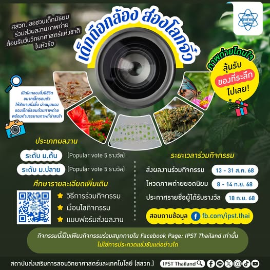 เพจ IPST Thailand สถาบันส่งเสริมการสอนวิทยาศาสตร์และเทคโนโลยี (สสวท.) เชิญนักเรียนมัธยมศึกษาปีที่ 1 – 6 ร่วมสนุกกิจกรรมถ่ายภาพสิ่งมีชีวิตขนาดเล็กพร้อมคำบรรยายภาพ ต้อนรับสัปดาห์วิทยาศาสตร์แห่งชาติ หัวข้อ“เด็กถือกล้อง ส่องโลกจิ๋ว”เปิดโลกของสิ่งมีชีวิตขนาดเล็กรอบตัวชัดเจนยิ่งขึ้น โดยผ่านมุมมองของนักเรียนมัธยมศึกษา ลุ้นรับของที่ระลึกจากเพจ IPST Thailand ส่งได้คนละ 1 ผลงาน โดยแบ่งเป็น 2 ประเภทคือ ระดับมัธยมศึกษาตอนต้น (ม.1– ม.3) และมัธยมศึกษาตอนปลาย (ม.4–ม.6) ไฟล์ภาพ คมชัด ไม่ใส่ลายน้ำ ไม่ใส่สติ๊กเกอร์ ไม่สร้างจากAI โดยภาพถ่ายที่มียอด engagement สูงสุด 5 อันดับแรกของแต่ละประเภทจะได้รับของที่ระลึกจากเพจ IPST Thailand ส่งผลงานได้ตั้งแต่บัดนี้ถึง 31 สิงหาคม 2568 ดูรายละเอียดที่
