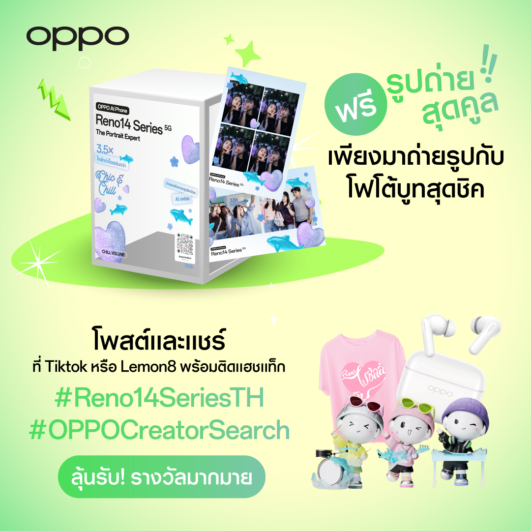 นอกจากคอนเสิร์ตสุดมันส์ที่ขนทัพเหล่าศิลปินมาแบบจัดเต็มแล้ว OPPO ยังยกกิจกรรมพิเศษมาเต็มอิ่ม ไม่ว่าจะเป็น โซน Photobooth สไตล์ Y2K สุดคิวต์ให้เพื่อนซี้มาถ่ายภาพเก็บความประทับใจด้วย OPPO Reno14 Series 5G สมาร์ตโฟนดีไซน์ชิค พร้อมฟีเจอร์ AI Flash Photography ที่ช่วยให้ถ่ายพอร์ตเทรตสวยคมแม้ในที่แสงน้อย ถ่ายทอดตัวตนได้ชัดในทุกโมเมนต์ รวมถึงยังมีป้ายไดคัทของเหล่า OPPO Family อย่างวงบอยแบนด์ BUS Because of you I shine และสแตนดี้ Reno แฟลช เกิร์ล อย่าง MINNIE of i-dle ให้เก็บภาพโมเมนต์ร่วมกันอีกด้วย สนุกต่อกับกิจกรรมสุดพิเศษ OPPO Creator Search ชวนเหล่านักศึกษาโดยเฉพาะ มาลุ้นเป็น OPPO KOL โพสต์และแชร์คอนเทนต์ลง TikTok หรือ Lemon8 ลุ้นรับฟรีทันที! OPPO Enco Buds3 Pro หูฟังจาก OPPO, เสื้อผ้า, กระเป๋า และของรางวัลอีกมากมาย!