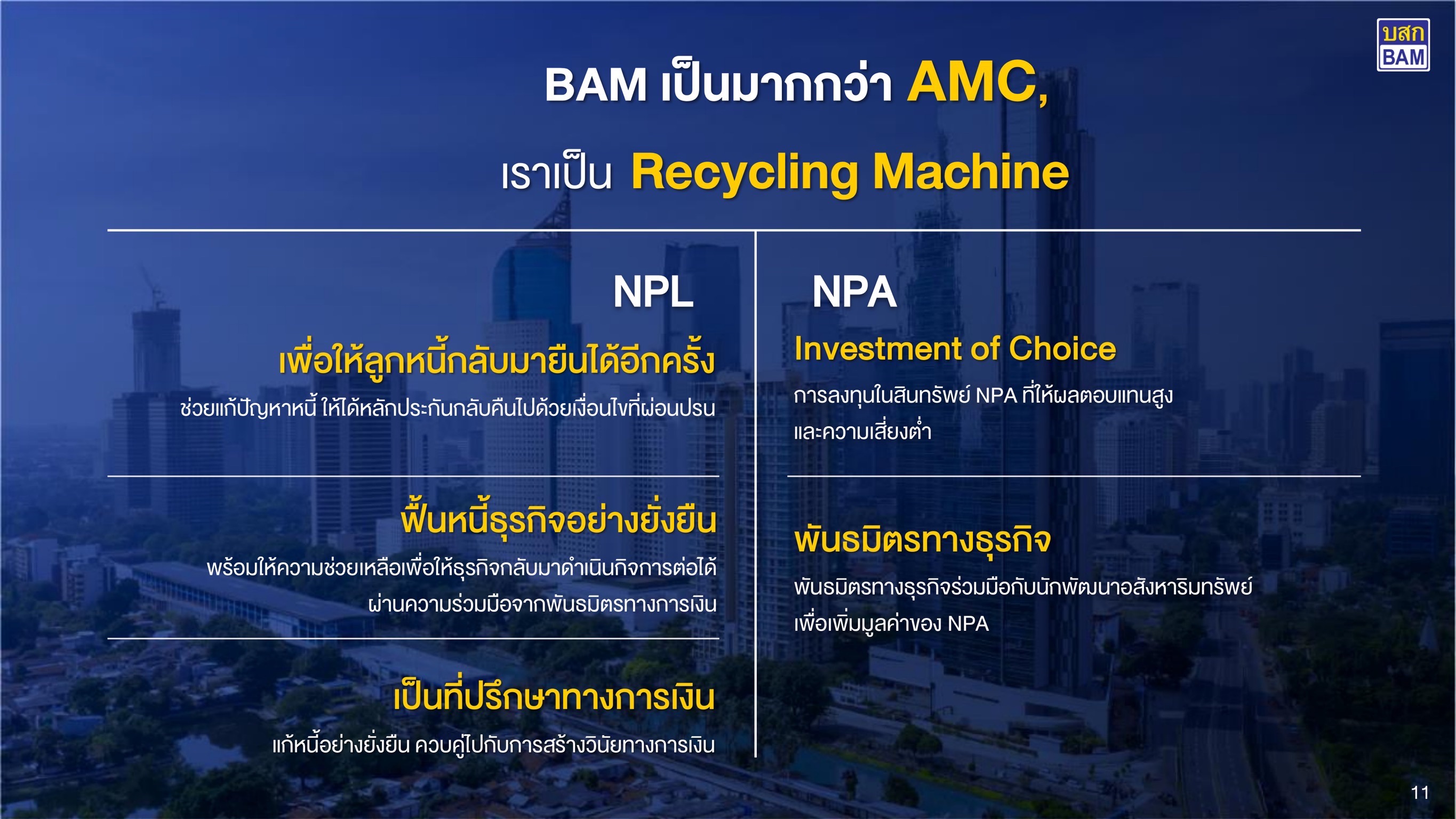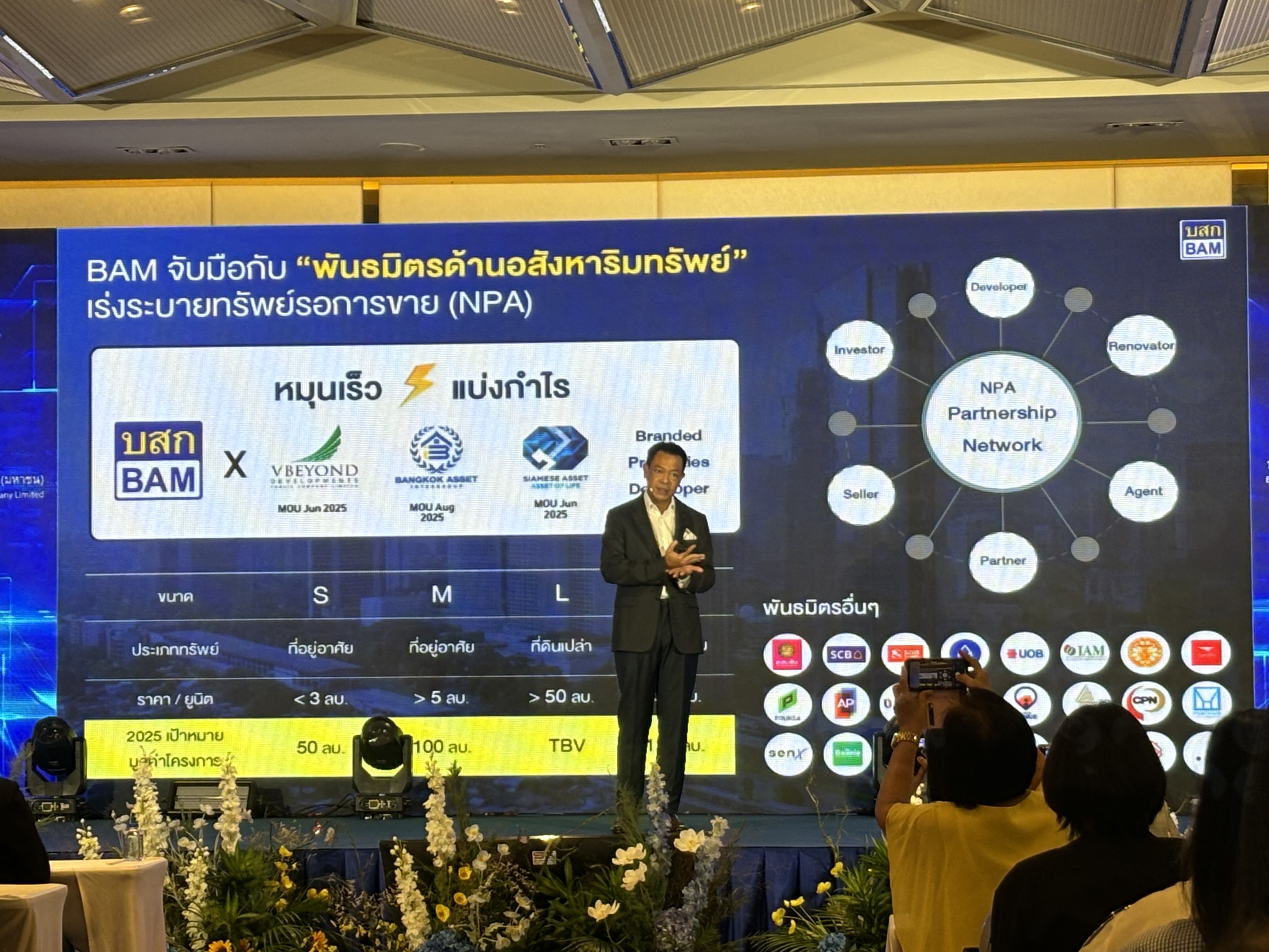 ขณะที่การบริหารจัดการทรัพย์สินรอการขาย หรือ NPA เดินหน้ากลยุทธ์พันธมิตรทางธุรกิจ (NPA Partnership) ซึ่งเป็นกลยุทธ์สำคัญที่มุ่งขยายฐานธุรกิจและสร้างรายได้เพิ่มขึ้น ผ่านความร่วมมือกับบริษัทพันธมิตรที่มีศักยภาพ อาทิ บริษัทอสังหาริมทรัพย์ ได้แก่ บริษัท วี บียอนด์ ดีเวลอปเม้นท์ จำกัด (มหาชน) บริษัท ไซมิส แอสเสท จำกัด (มหาชน) และบริษัท บางกอก แอสเซท อินเตอร์กรุ๊ป จำกัด (มหาชน) และสถาบันการเงิน เช่น ธนาคารยูโอบี ธนาคารกรุงเทพ ธนาคารอาคารสงเคราะห์ โดย BAM มุ่งเน้นการคัดสรรและนำเสนอทรัพย์ NPA ขนาด Big Lots ให้พันธมิตรนำไปพัฒนาและเพิ่มมูลค่า ทั้งบ้านเดี่ยว อาคารพาณิชย์ คอนโดมิเนียม และที่ดินเปล่า เพื่อพลิก “ทรัพย์ร้าง” ให้กลายเป็น “ทรัพย์สร้างกำไร” ต่อยอดเป็นทรัพย์สินที่สร้างรายได้ให้กับ BAM อย่างต่อเนื่อง ลดระยะเวลาการถือครอง และสร้างผลตอบแทนที่สูงขึ้นในระยะยาว โดย BAM สามารถสร้างยอดขายจากการจำหน่ายทรัพย์แปลงใหญ่ได้ถึง 1,450 ล้านบาท ซึ่งทรัพย์ดังกล่าวเป็นที่ดินเปล่าจำนวน 50 แปลง ตั้งอยู่ที่อำเภอเมืองเชียงใหม่ จังหวัดเชียงใหม่ เนื้อที่รวม 26-3-37.40 ไร่