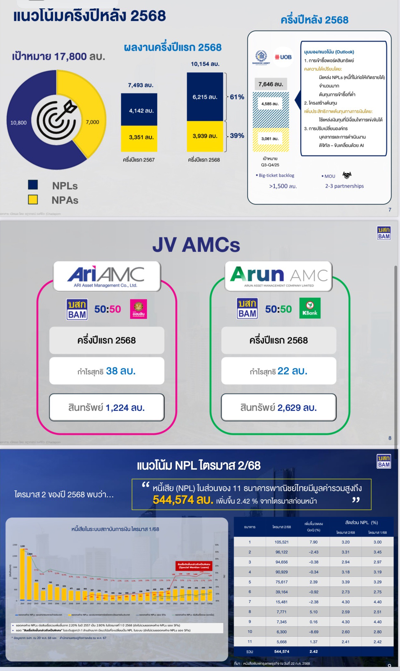 ดร.รักษ์ กล่าวต่อถึงผลการดำเนินงานครึ่งแรกปี 2568 ว่า โดยภาพรวมเป็นที่น่าพอใจ สามารถสร้างผลเรียกเก็บได้สูงถึง 10,154 ล้านบาท เมื่อเทียบกับช่วงเดียวกันของปีก่อนที่ทำได้ 7,493 ล้านบาท หรือโตถึง 36% ขณะที่ไตรมาสที่ 2 ของปีนี้ มีผลเรียกเก็บ 6,962 ล้านบาท เพิ่มขึ้นจากไตรมาสแรก ที่มีผลเรียกเก็บ 3,192 ล้านบาท หรือเพิ่มขึ้นมากถึง 118% และมีกำไร 1,511 ล้านบาท หรือเพิ่มขึ้น 72% จากช่วงเดียวกันของปีก่อนที่มีกำไรสุทธิอยู่ที่ 880 ล้านบาท ซึ่งผลงานทางด้าน NPL ยังใช้แนวทางที่ให้โอกาสลูกหนี้ในการได้หลักประกันซึ่งเป็นที่อยู่อาศัยหรือที่ทำกินกลับคืนไปด้วยเงื่อนไขที่ผ่อนปรน และมุ่งช่วยเหลือลูกหนี้ให้สามารถฟื้นฟูกิจการหรือสถานะทางการเงินของตน โดยปรับโครงสร้างหนี้และหาทางออกที่ดีที่สุดร่วมกัน ด้วยกระบวนการ Recycling Machine ซึ่งมีเป้าหมายในการเร่งสร้างโรงงานแก้หนี้ (TDR Factory) เพื่อฟื้นฟูให้ลูกหนี้กลับมามีสุขภาพทางการเงินที่ดีขึ้น ซึ่ง BAM สามารถสร้างรายได้จากการปรับโครงสร้างหนี้ NPL ลูกหนี้รายใหญ่รายหนึ่งได้ข้อยุติถึง 2,800 ล้านบาท