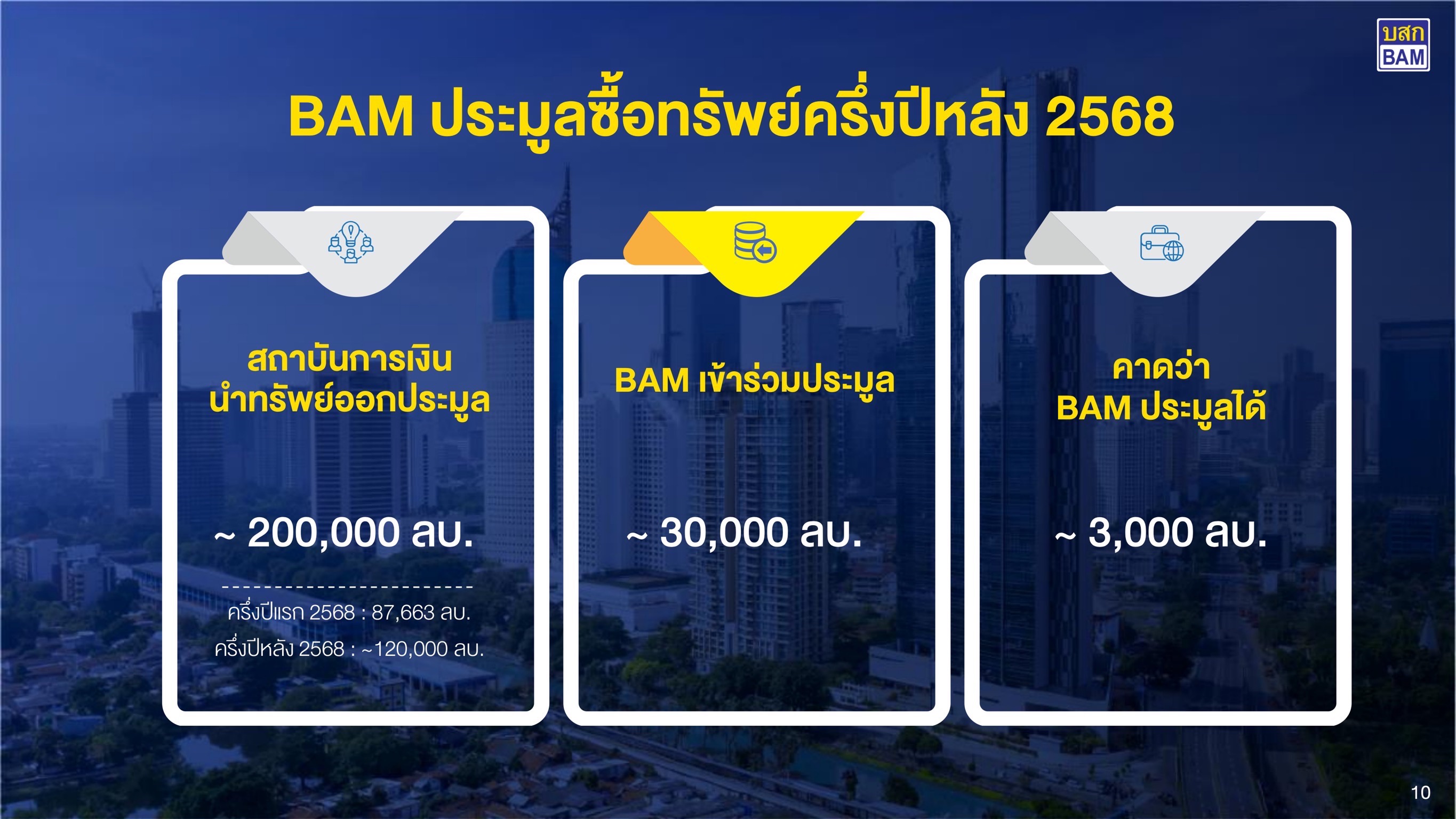 ดร.รักษ์ วรกิจโภคาทร ประธานเจ้าหน้าที่บริหาร บริษัทบริหารสินทรัพย์ กรุงเทพพาณิชย์ จำกัด (มหาชน) หรือ BAM เปิดเผยว่า ในช่วงครึ่งหลังปี 2568 นี้ BAM เตรียมประมูลทรัพย์อีกประมาณ 3 หมื่นล้านบาท เพราะคาดว่ากลุ่มสถาบันการเงินจะนำทรัพย์ออกมาประมูลขายมูลค่ารวมประมาณกว่า 200,000 ล้านบาท โดยคาดว่าการประมูลครั้งนี้ BAM น่าจะได้ทรัพย์ที่ประมูลได้ประมาณ 3,000 ล้านบาท
