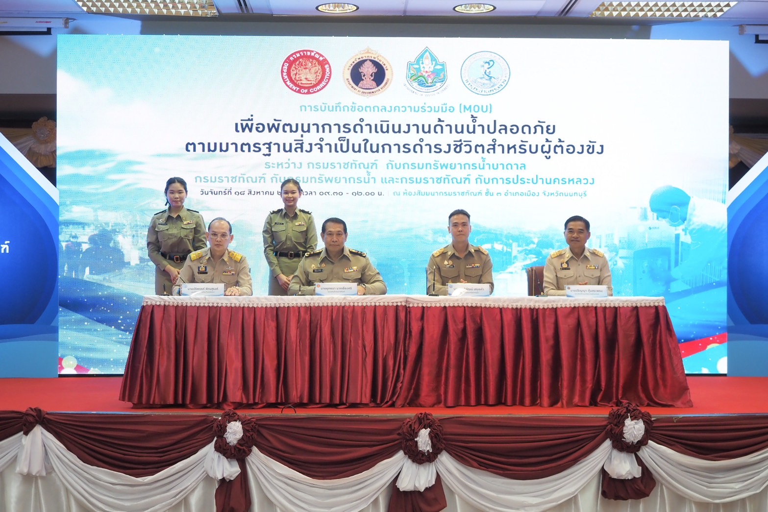 นายปริพรรห์ พิณสุรงค์ รองผู้ว่าการการประปานครหลวง (กปน.) พร้อมด้วย นายยุทธนา นาคเรืองศรี รองอธิบดีกรมราชทัณฑ์ นายปริญญา คุ้มสระพรม รองอธิบดีกรมทรัพยากรน้ำบาดาล และ นายพงศ์พัฒน์ เสมอคำ รองอธิบดีกรมทรัพยากรน้ำ ร่วมลงนามในบันทึกข้อตกลงความร่วมมือ (MOU) เพื่อพัฒนาการดำเนินงานด้าน น้ำปลอดภัยตามมาตรฐานสิ่งจำเป็นในการดำรงชีวิตสำหรับผู้ต้องขัง เพื่อยกระดับมาตรฐานการจัดการคุณภาพน้ำอุปโภคบริโภคในเรือนจำ ทัณฑสถาน และสถานกักขัง ครอบคลุมการตรวจวิเคราะห์คุณภาพน้ำทางห้องปฏิบัติการ การให้คำแนะนำในการปรับปรุงคุณภาพน้ำ และการสนับสนุนองค์ความรู้ด้านการจัดการน้ำอย่างปลอดภัย