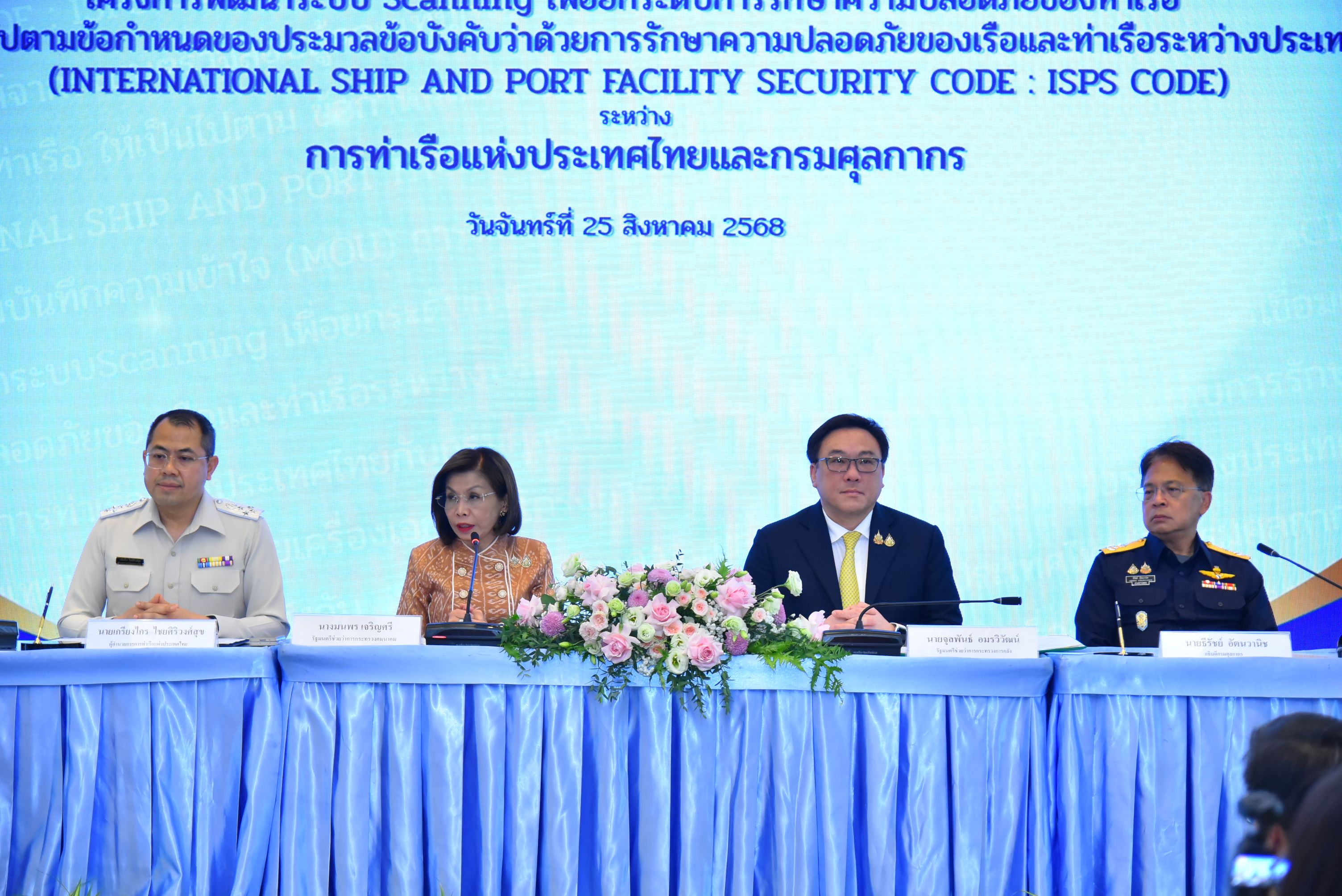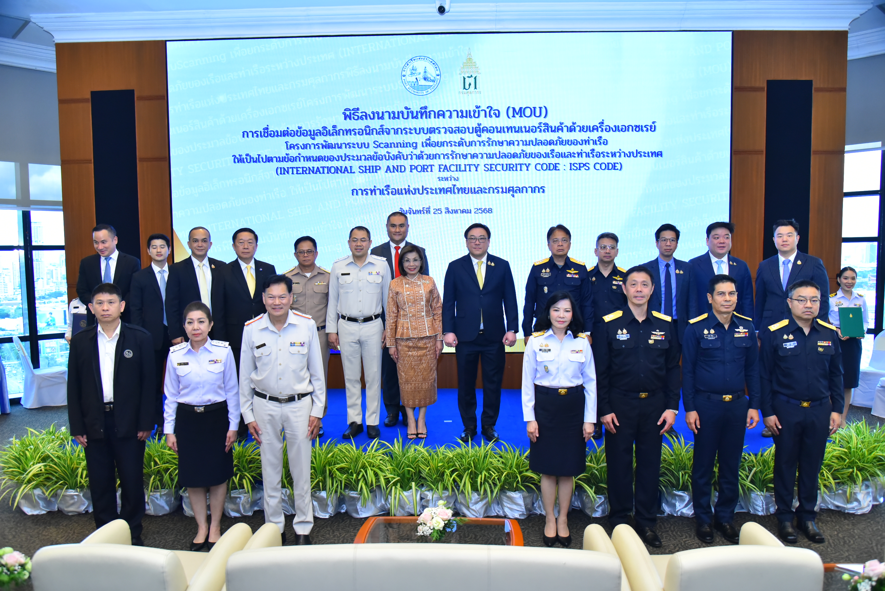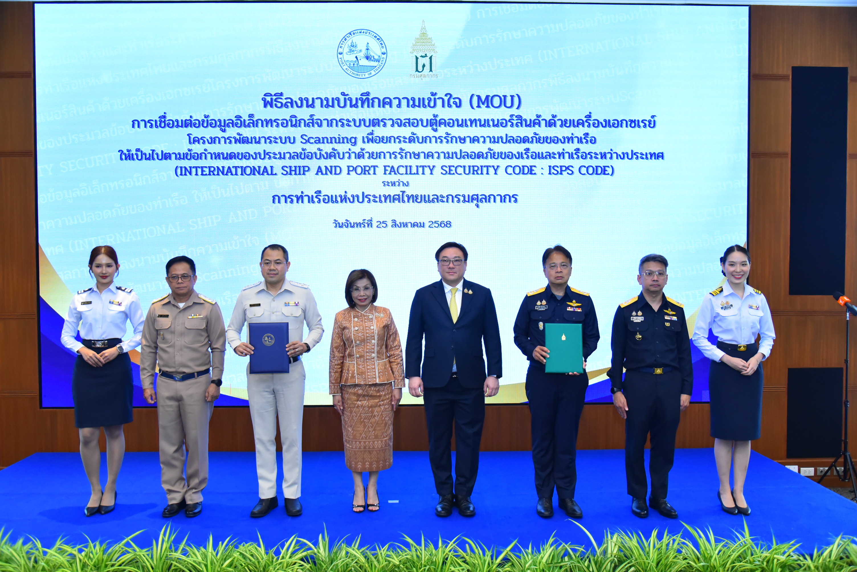 วันนี้ (25 สิงหาคม 2568) เวลา 15.30 น. นายธีรัชย์ อัตนวานิช อธิบดีกรมศุลกากร และนายเกรียงไกร ไชยศิริวงศ์สุข ผู้อำนวยการการท่าเรือแห่งประเทศไทย ร่วมลงนามในบันทึกความเข้าใจ (Memorandum of Understanding : MOU) การเชื่อมต่อข้อมูลอิเล็กทรอนิกส์จากระบบตรวจสอบตู้คอนเทนเนอร์สินค้าด้วยเครื่องเอกซเรย์ โครงการพัฒนาระบบ Scanning เพื่อยกระดับการรักษาความปลอดภัยของท่าเรือ ให้เป็นไปตามข้อกำหนดของประมวลข้อบังคับว่าด้วยการรักษาความปลอดภัยของเรือและท่าเรือระหว่างประเทศ (INTERNATIONAL SHIP AND PORT FACILITY SECURITY CODE : ISPS CODE) โดยมีนายจุลพันธ์ อมรวิวัฒน์ รัฐมนตรีช่วยว่าการกระทรวงการคลัง และนางมนพร เจริญศรี รัฐมนตรีช่วยว่าการกระทรวงคมนาคม ร่วมเป็นสักขีพยาน