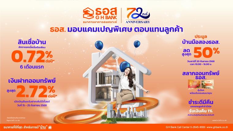 ธนาคารอาคารสงเคราะห์ (ธอส.) ฉลองครบ 6 รอบ 72 ปี มุ่งมั่นเดินหน้าสู่ความยั่งยืน สนับสนุนคนไทยมีที่อยู่อาศัยเป็นของตนเอง พร้อมจัดแคมเปญสุดพิเศษมอบเป็นของขวัญตอบแทนลูกค้าและประชาชน สานต่อพันธกิจ “ทำให้คนไทยมีบ้าน” นำโดย (1) สินเชื่อบ้านอัตราดอกเบี้ยพิเศษเริ่มต้นเพียง 0.72% ต่อปี (2) เงินฝากออมทรัพย์ อัตราดอกเบี้ยสูงสุดถึง 2.72% ต่อปี (3) ลุ้นโชคกับสลากออมทรัพย์ ธอส. พร้อมรับของสมนาคุณมากมาย และ (4) ประมูลบ้านมือสองทั่วประเทศกับส่วนลดสูงสุด 50% ราคาต่ำสุดเริ่มต้นเพียง 70,000 บาท และ (5) โครงการชำระดีมีคืน รับเงินคืน 1% ของดอกเบี้ยเงินกู้ที่ชำระในปี 2567