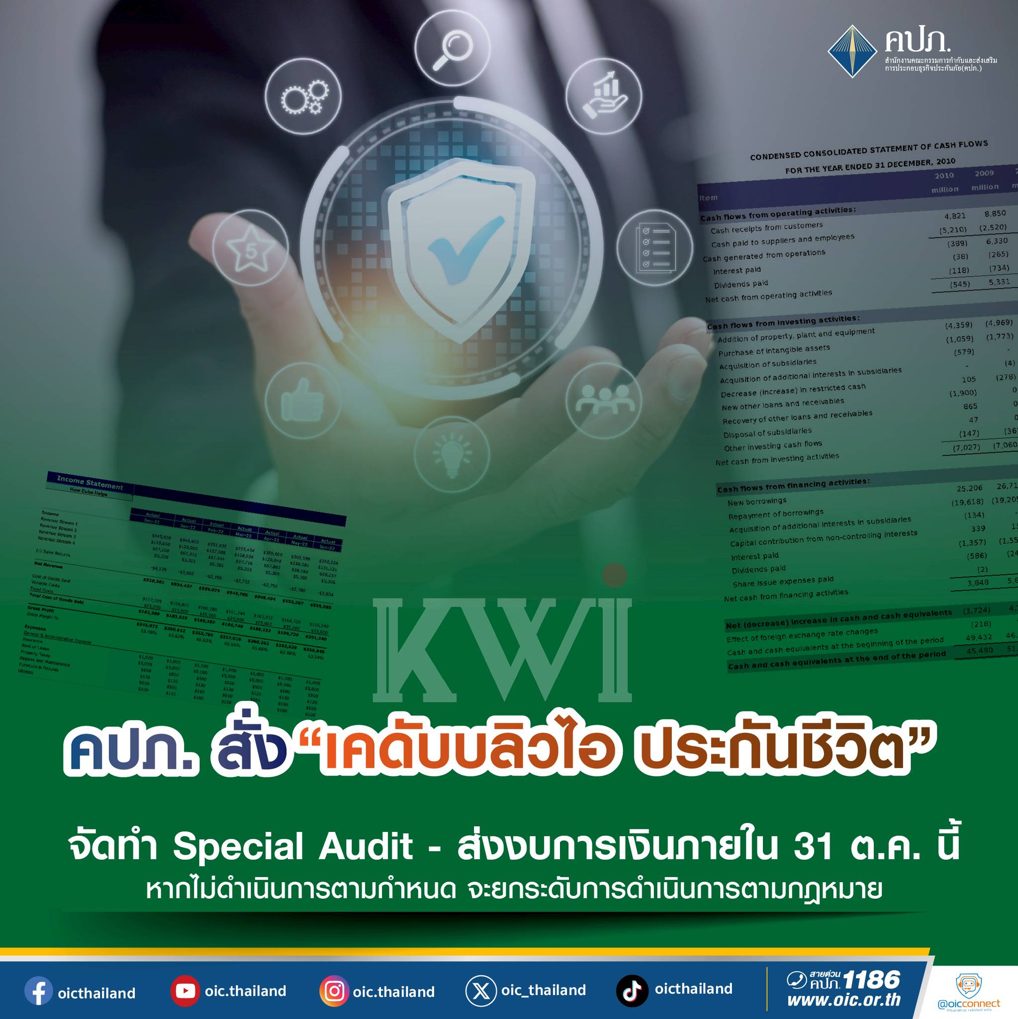 สำนักงานคณะกรรมการกำกับและส่งเสริมการประกอบธุรกิจประกันภัย (สำนักงาน คปภ.) เดินหน้าคุมเข้ม “เคดับบลิวไอ ประกันชีวิต” ออกคำสั่งนายทะเบียนที่ 52/2568 ให้จัดทำและนำส่งรายงานผลการตรวจสอบกรณีพิเศษ (Special Audit) และเร่งส่งงบการเงิน ประจำปี 2567 และไตรมาส 1 ปี 2568 ภายใน 31 ตุลาคมนี้ ป้องกันความเสียหายต่อผู้เอาประกันภัยหากไม่ดำเนินการตามกำหนด จะยกระดับการดำเนินการตามกฎหมาย