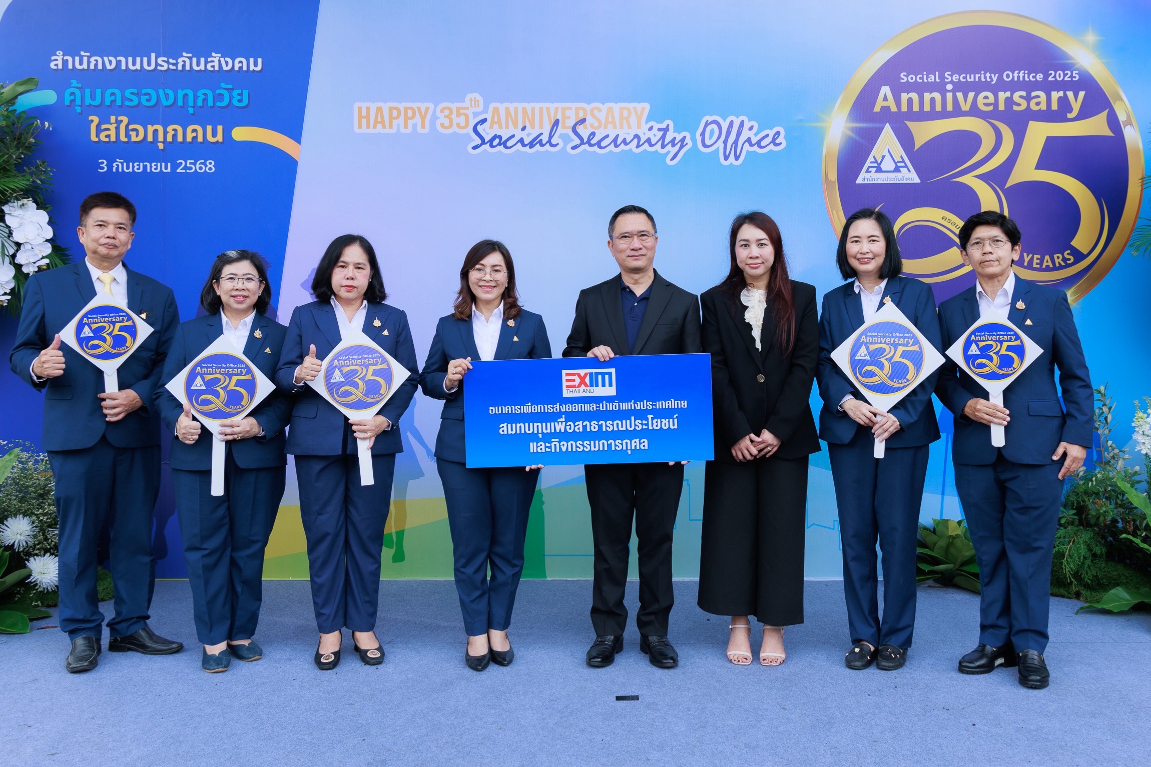 นายชลัช รัตนบุญนิธิ ผู้ช่วยกรรมการผู้จัดการ ธนาคารเพื่อการส่งออกและนำเข้าแห่งประเทศไทย (EXIM BANK) แสดงความยินดีกับนางสาวบุปผา เรืองสุด รองปลัดกระทรวงแรงงาน รักษาราชการแทน เลขาธิการสำนักงานประกันสังคม (สปส.) พร้อมมอบเงินสมทบกองทุนสวัสดิการ สปส. ในโอกาสวันคล้ายวันสถาปนา สปส. ครบรอบ 35 ปี ณ สปส. สำนักงานใหญ่ เมื่อวันที่ 3 กันยายน 2568