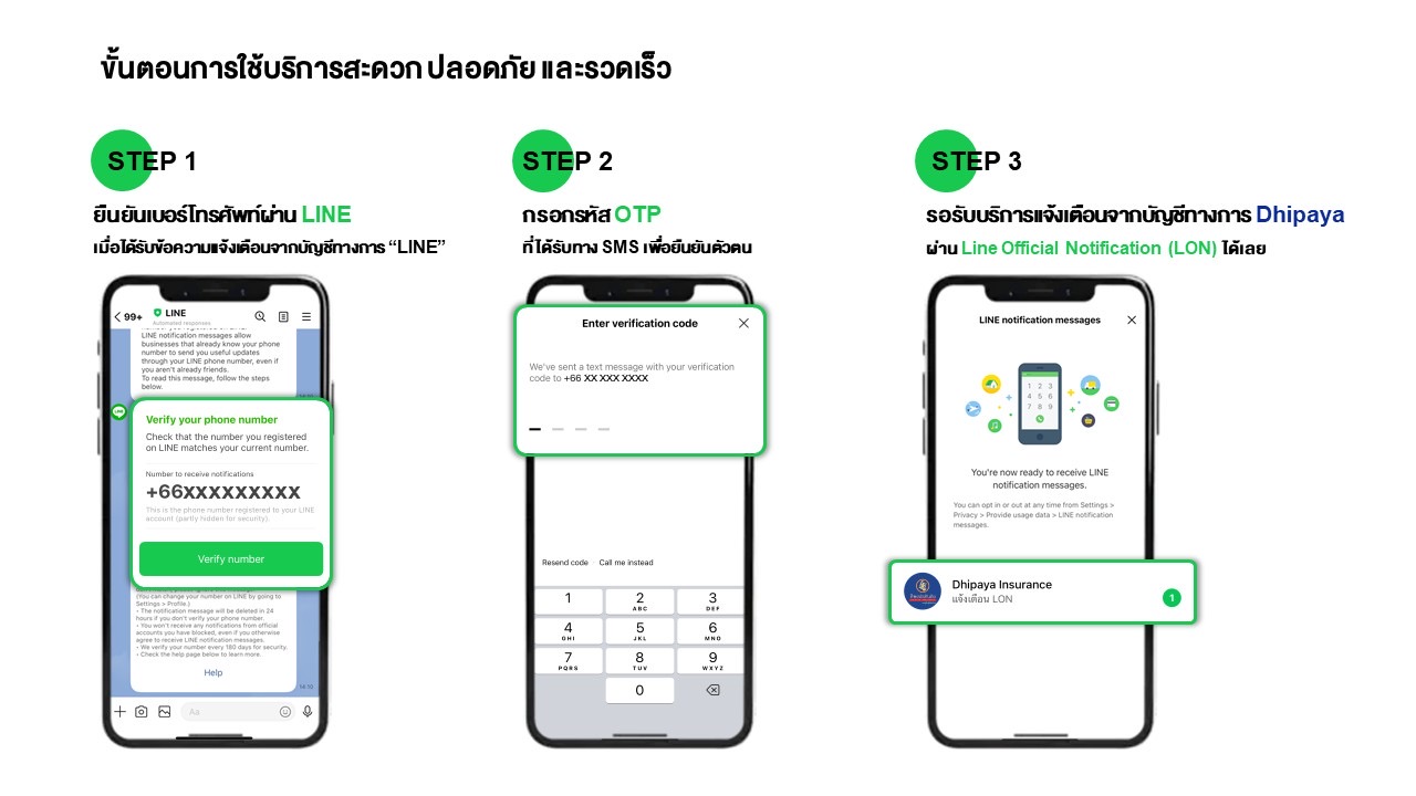 คุณสุภาพ ประดับการ กล่าวว่า “บริการ LINE Official Notification (LON) ถือเป็นอีกหนึ่งก้าวสำคัญของทิพยประกันภัยในการพัฒนา Ecosystem การให้บริการลูกค้าอย่างไร้รอยต่อ (Seamless) รองรับไลฟ์สไตล์ยุคดิจิทัลอย่างแท้จริง โดย LON จะเข้ามาแทนการแจ้งเตือนผ่าน SMS ที่เสี่ยงต่อการถูกปลอมแปลง ลูกค้าจึงมั่นใจได้ว่าทุกข้อความที่ได้รับมาจากทิพยประกันภัยโดยตรง 100% อีกทั้งยังสามารถดาวน์โหลดกรมธรรม์ ติดตามสถานะการให้บริการต่ออายุประกันภัย และใช้บริการต่าง ๆ ได้ครบจบในที่เดียวผ่าน LINE Official Account ของเรา”
