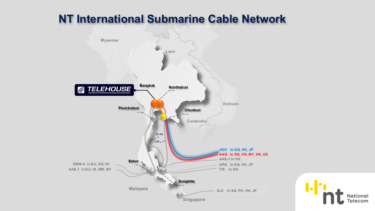 บริษัท โทรคมนาคมแห่งชาติ จำกัด (มหาชน) หรือ NT ได้ร่วมมือกับ Telehouse Thailand ผู้นำด้านบริการดาต้าเซ็นเตอร์ระดับโลก ให้บริการโครงข่ายรับ-ส่งข้อมูลผ่านระบบเคเบิลใต้น้ำระหว่างประเทศ โดยเชื่อมโยงจากสถานีเคเบิลใต้น้ำ ศรีราชา ไปยังอาคาร Telehouse Bangkok ในกรุงเทพฯ พร้อมให้บริการแล้ววันนี้ เพื่อยกระดับประสิทธิภาพโครงข่ายการสื่อสารของประเทศไทยให้แข็งแกร่งยิ่งขึ้น สนับสนุนการพัฒนาระบบไอทีของประเทศทั้งภาครัฐและเอกชน