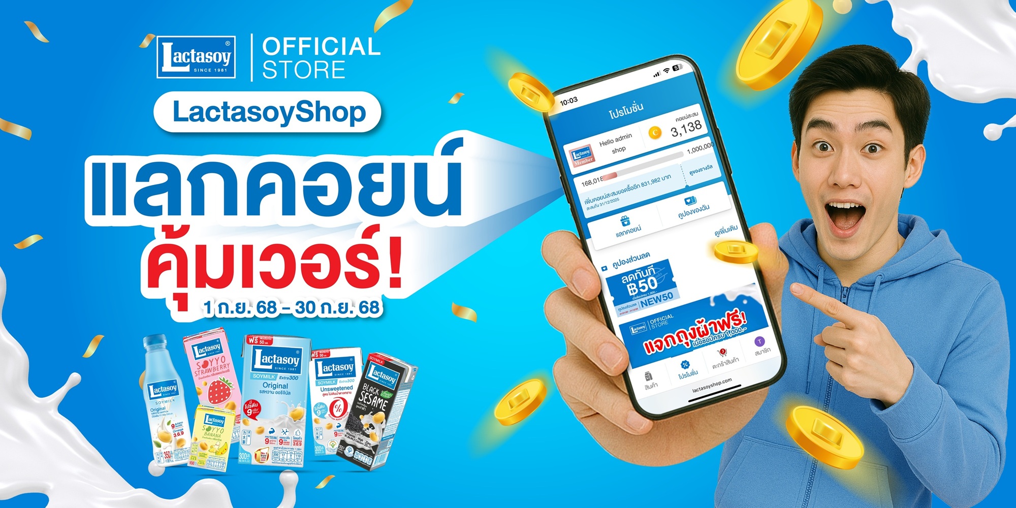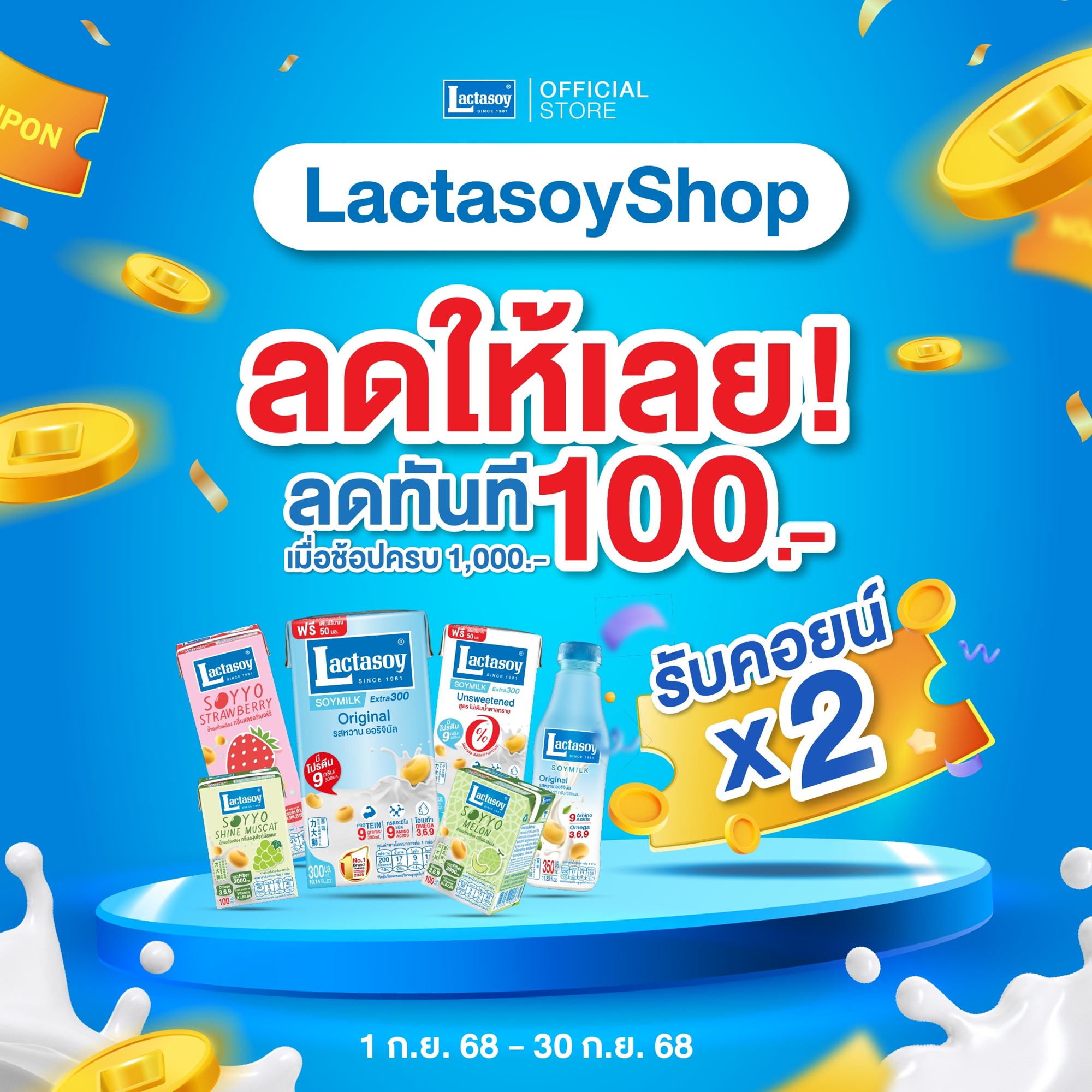 แลคตาซอย ป้ายยาสายช้อปรักสุขภาพ ด้วยโปรแรงแบบจุกๆ เพียงช้อปผลิตภัณฑ์แลคตาซอย ครบ 1,000 บาท รับส่วนลดทันที 100 บาท พร้อมรับคะแนนคอยน์คูณ 2 ช้อปได้ทาง https://www.lactasoyshop.com และยังเอาใจสายสะสมคอยน์ เปิดให้นำมาแลกของพรีเมี่ยมสุดว้าว มีจำนวนจำกัดนะรีบเลย ตลอดเดือนกันยายนนี้เท่านั้น