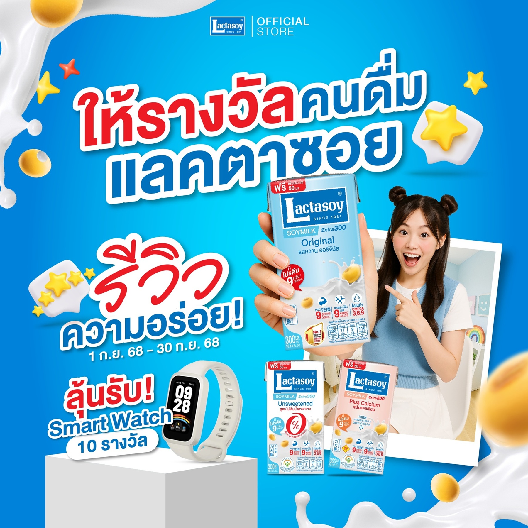 นอกจากนี้ ยังจัดกิจกรรมรีวิวความอร่อยหลังดื่มแลคตาซอย ลุ้นรับ Smart Watch ไปใส่เก็บฟิตเก็บฟอร์มกันถึง 10 รางวัล กติกาแสนง่ายเพียงแชร์โพสต์กิจกรรมนี้แล้วเปิดเป็นสาธารณะ จากนั้นถ่ายรูปดื่มแลคตาซอยรสชาติใดก็ได้ โพสต์ลงโซเชียลเปิดเป็นสาธารณะ ติดแฮชแท็ก #นมถั่วเหลือง #แลคตาซอย #Soymilk #Lactasoy #ดื่มทุกวัน แล้วแคปมาคอมเมนต์ใต้กิจกรรมนี้ เพื่อยืนยันการร่วมสนุก ตั้งแต่วันนี้ถึง 30 ก.ย.68 ประกาศผลผู้โชคดี 15 ต.ค.68 ทาง FB: LactasoyClub