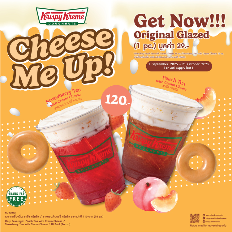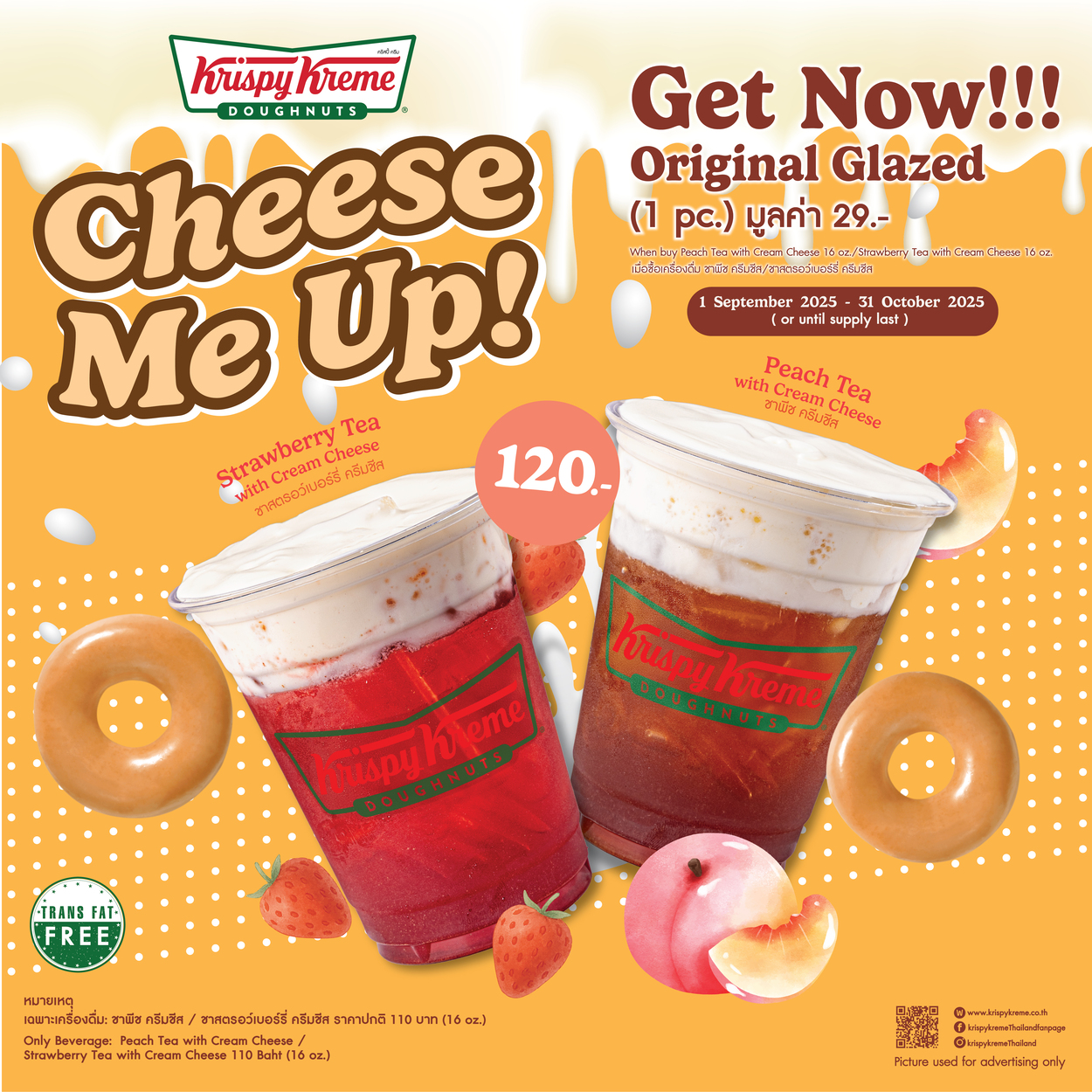 สัมผัสความหอมสดชื่นเต็มรสผลไม้ไปกับ Krispy Kreme Cheese Me Up! พร้อมจับคู่ความอร่อยคูณสอง เมื่อซื้อเครื่องดื่ม Krispy Kreme Cheese Me Up! เมนูใดก็ได้ 1 แก้ว และโดนัท คริสปี้ ครีม ออริจินอล เกลซ 1 ชิ้น ในราคาเพียง 120 บาท ได้ตั้งแต่วันที่ 1 กันยายน - 31 ตุลาคม 2568 ณ ร้านคริสปี้ ครีม 26 สาขาที่ร่วมรายการเท่านั้น