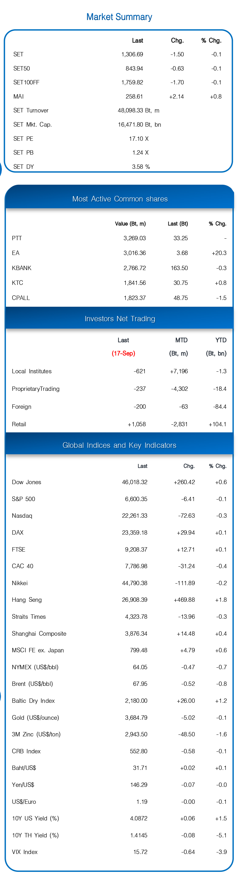 แกว่งแคบ รอผลประชุม FED – SET แกว่ง +/- สลับกันในกรอบแคบ 1304-11 และปิดลบเล็กน้อยจากแรงขายทำกำไรหลังขึ้น 8 วันติดก่อนหน้านี้และสัญญาณเทคนิคอยู่ในภาวะ “Overbought” รอติดตามผลประชุม FED ต่างชาติพลิกขายสุทธิ 200 ลบ. ยุติซื้อ 2 วันติด แต่พลิก Long S50 Futures 1,412 สัญญา ยุติ Short 3 วันติด