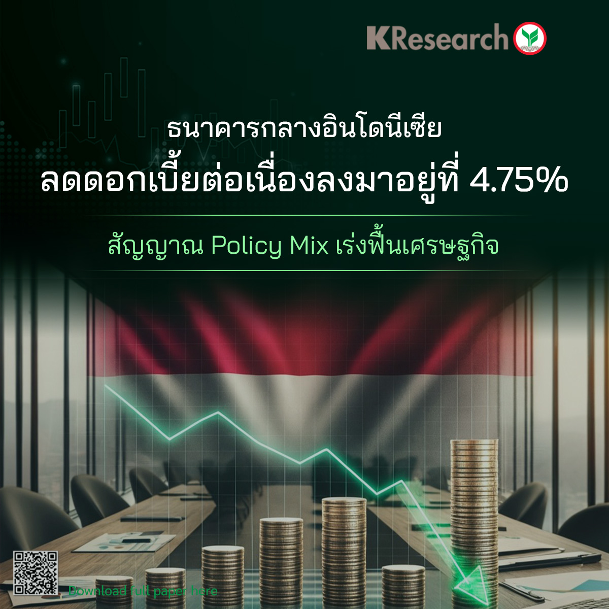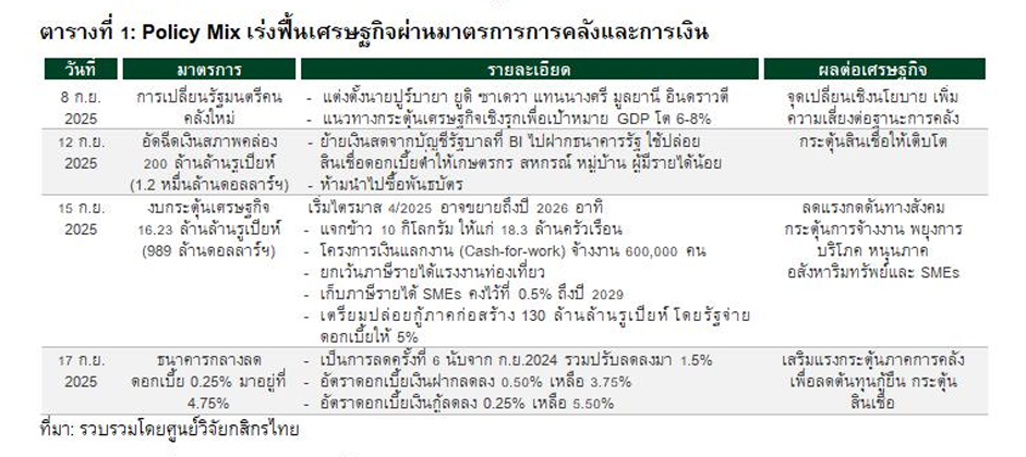 ศูนย์วิจัยกสิกรไทย มองว่า BI มีแนวโน้มลดดอกเบี้ยได้ต่อในระยะข้างหน้า ภายใต้สถานการณ์เงินเฟ้อที่ยังอยู่ในกรอบและการปรับลดดอกเบี้ยของ Fed ซึ่งช่วยผ่อนคลายแรงกดดันต่อค่าเงินรูเปียห์ เปิดโอกาสให้ BI เดินหน้าผ่อนคลายการเงินได้มากขึ้น อย่างไรก็ดี แม้การผสานนโยบายการเงินและการคลังจะช่วยหนุนเศรษฐกิจ แต่การบรรลุเป้าหมาย GDP โต 6-8% ในปีนี้ยังเป็นโจทย์ท้าทาย เนื่องจากผลของนโยบายต้องใช้เวลาส่งผ่าน ทั้งยังมีโจทย์สำคัญในการรักษาวินัยการคลังเพื่อคงความเชื่อมั่นเศรษฐกิจในระยะต่อไป