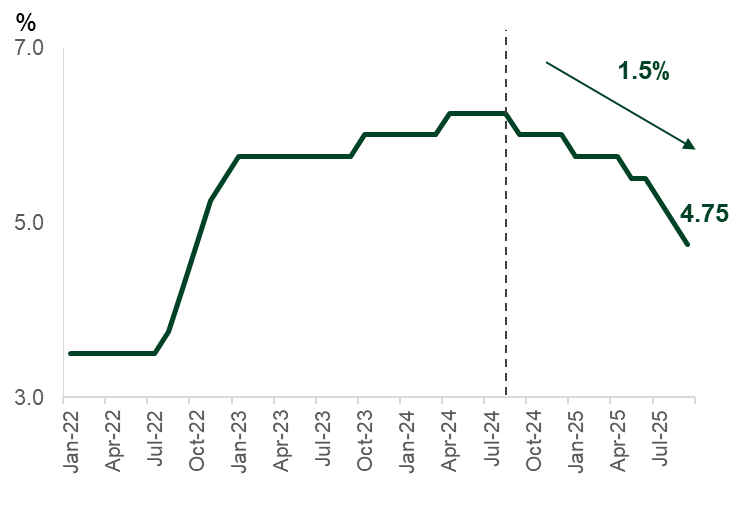 ธนาคารกลางอินโดนีเซีย (BI) เดินหน้าลดดอกเบี้ยต่อเนื่องหนุนการฟื้นตัวของเศรษฐกิจ โดย BI มีมติในการประชุมวันที่ 16-17 ก.ย. 2025 ลดดอกเบี้ยนโยบายลงอีก 0.25% เหลือ 4.75% ถือเป็นครั้งที่ 6 นับจาก ก.ย.2024 รวมลดแล้ว 1.5% สะท้อนการให้น้ำหนักกับการเติบทางเศรษฐกิจและเป็นทิศทางที่สอดคล้องกับนโยบายการคลัง โดยมีประเด็นสำคัญที่ต้องติดตาม ดังนี้