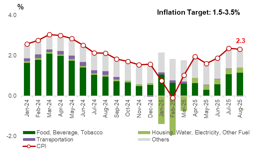 • เงินเฟ้อยังอยู่ในกรอบของ BI หนุนการลดดอกเบี้ยต่อ โดยเงินเฟ้อเดือน ส.ค. 2025 อยู่ที่ 2.31% ลดลงจากเดือนก่อนหน้า (รูปที่ 1) จากปัจจัยค่าใช้จ่ายเปิดเทอมและการขนส่งที่คลี่คลาย แม้ราคาข้าวยังสูง แต่โดยรวมเงินเฟ้อในปีนี้มีแนวโน้มยังอยู่ในกรอบเป้าหมาย 1.5–3.5% ของ BI เปิดโอกาสให้ปรับลดดอกเบี้ยได้อีกในไตรมาสสุดท้าย หากทางการยังสามารถประคองค่าเงินรูเปียห์ให้มีเสถียรภาพได้