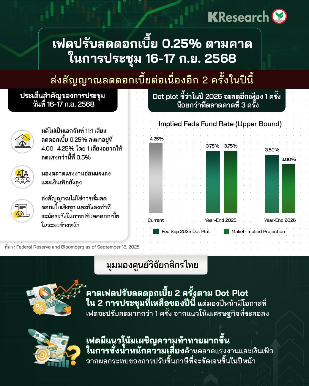 ในการประชุม FOMC 16-17 ก.ย. 2568 เฟดมีมติไม่เป็นเอกฉันท์ 11:1 เสียงลดดอกเบี้ยนโยบาย 0.25% ลงมาอยู่ที่ 4.00-4.25% โดย 1 เสียงอยากให้ลดแรงกว่านี้ที่ 0.5%