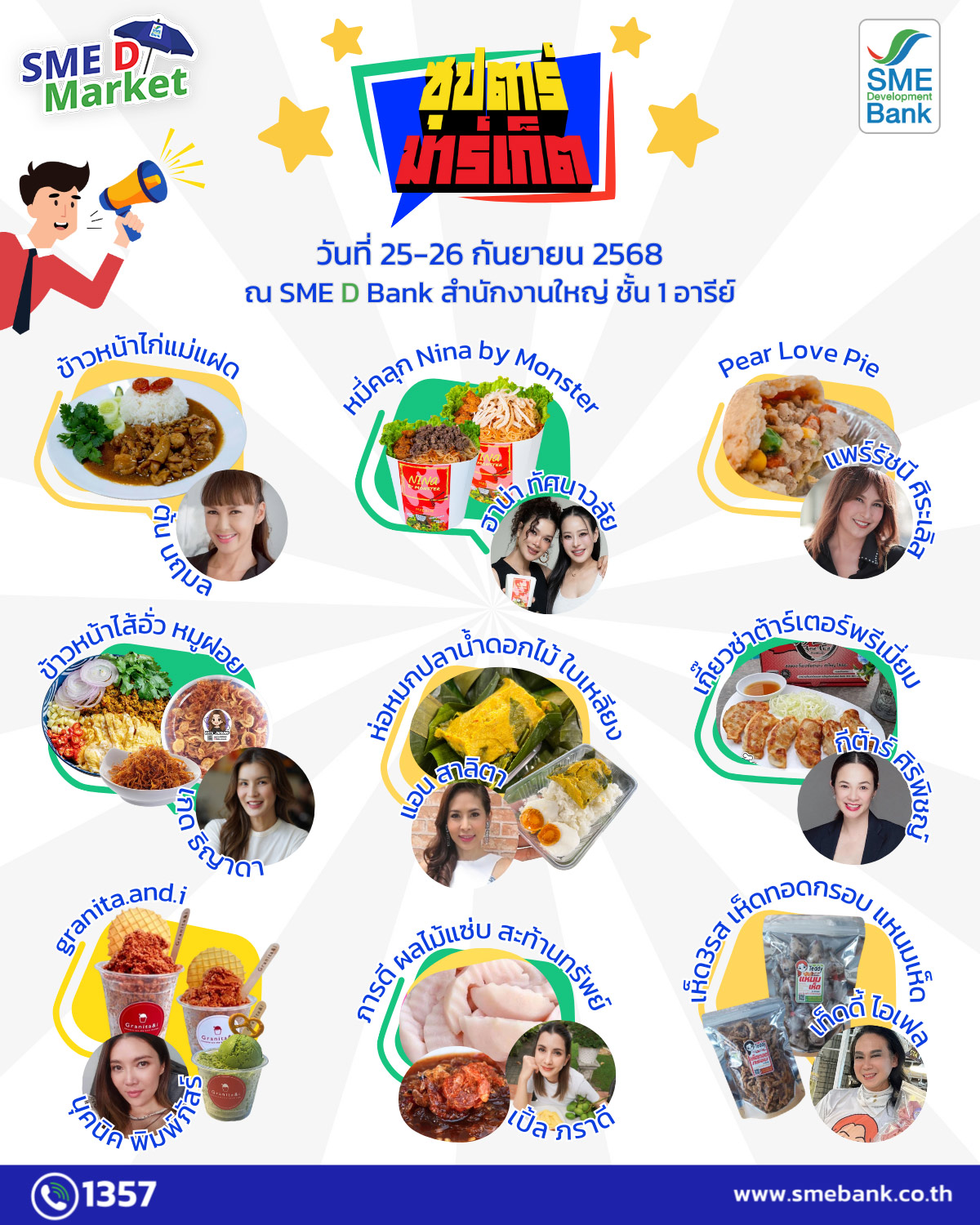 ธนาคารพัฒนาวิสาหกิจขนาดกลางและขนาดย่อมแห่งประเทศไทย (ธพว.) หรือ SME D Bank จัดกิจกรรมช่วยผู้ประกอบการเอสเอ็มอีเพิ่มรายได้ ขยายตลาด ปลุกกำลังซื้อ ขับเคลื่อนเศรษฐกิจไทยให้คึกคัก ในงาน"SME D Market" จัดระหว่างวันที่ 25-26 กันยายน 2568 ณ หน้าอาคาร และบริเวณชั้น 1 อาคาร SME Bank Tower สำหรับเดือนนี้ จัดภายใต้ธีม "ซุปตาร์มาร์เก็ต แท็กทีมหนุนเอสเอ็มอีไทย" ยกขบวนคนดัง ทั้งดารา นักแสดง มาร่วมออกบูธจำหน่ายสินค้า เพื่อสร้างแรงบันดาลใจในการทำธุรกิจ เปิดมุมมองการเป็นผู้ประกอบการ รวมถึง สร้างสีสันกระตุ้นส่งเสริมการตลาดให้ผู้ประกอบการเอสเอ็มอี เช่น “ภารดี ผลไม้แซ่บ สะท้านทรัพย์” คุณเปิ้ล ภารดี วงษ์สวัสดิ์, “หมี่คลุก Nina by Monster” โดยคุณฮาน่า ทัศนาวลัย , “เกี๊ยวซ่าต้าร์เตอร์พรีเมี่ยม” คุณกีตาร์ ศิริพิชญ์ วิมลโนช , “ฉ่ำ ข้าวแต๋นน้ำแตงโม” คุณอนุสรา วันทองทักษ์ (เปรี้ยว AF) "ข้าวหน้าไส้อั่ว หมูฝอย" คุณเกด ธิญาดา พรรณบัว และ “ครัวป้าโก้” คุณโก้ - ธีรศักดิ์ พันธุจริยา เป็นต้น