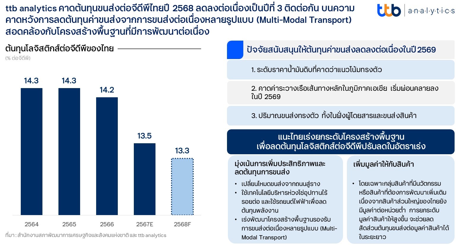 ศูนย์วิเคราะห์เศรษฐกิจ ทีทีบี หรือ ttb analytics ประเมินสัดส่วนต้นทุนโลจิสติกส์ต่อจีดีพีปี 2568 ลดเหลือ 13.3% และคาดว่าจะปรับลดอีกในปี 2569 ใกล้แตะระดับ 13.0% จากราคาน้ำมันดิบที่คาดว่าจะทรงตัวและค่าระวางในเส้นทางหลักเริ่มผ่อนคลายจากปีก่อน รวมถึงการขนส่งทางอากาศที่ได้รับแรงกดดันจากภาคท่องเที่ยว ตามแนวโน้มเศรษฐกิจโลกเติบโตในอัตราที่ชะลอตัวลง บนความคาดหวังต้นทุนค่าขนส่งที่จะลดลงจากการขนส่งต่อเนื่องหลายรูปแบบ (Multi-Modal Transport) สอดคล้องกับโครงสร้างพื้นฐานที่มีการพัฒนาต่อเนื่อง