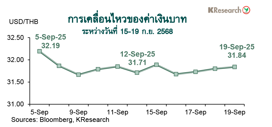 • สัปดาห์ระหว่างวันที่ 22-26 ก.ย. 2568 ธนาคารกสิกรไทยมองกรอบการเคลื่อนไหวของค่าเงินบาทที่ระดับ 31.50-32.20 บาทต่อดอลลาร์ฯ ขณะที่ศูนย์วิจัยกสิกรไทยประเมินปัจจัยสำคัญที่ต้องติดตาม ได้แก่ ตัวเลขการส่งออกเดือนส.ค. ของไทย ทิศทางฟันด์โฟลว์ของต่างชาติ ถ้อยแถลงของเจ้าหน้าที่เฟด และราคาทองคำในตลาดโลก ส่วนตัวเลขเศรษฐกิจสหรัฐฯ ที่สำคัญ ได้แก่ ยอดขายบ้านใหม่ ยอดขายบ้านมือสอง ยอดสั่งซื้อสินค้าคงทน และดัชนีราคา PCE/Core PCE เดือนส.ค. ตัวเลขจีดีพีไตรมาส 2/2568 (final) ดัชนีความเชื่อมั่นและตัวเลขเงินเฟ้อคาดการณ์ของผู้บริโภคเดือนก.ย. ตลอดจนจำนวนผู้ขอรับสวัสดิการว่างงานรายสัปดาห์