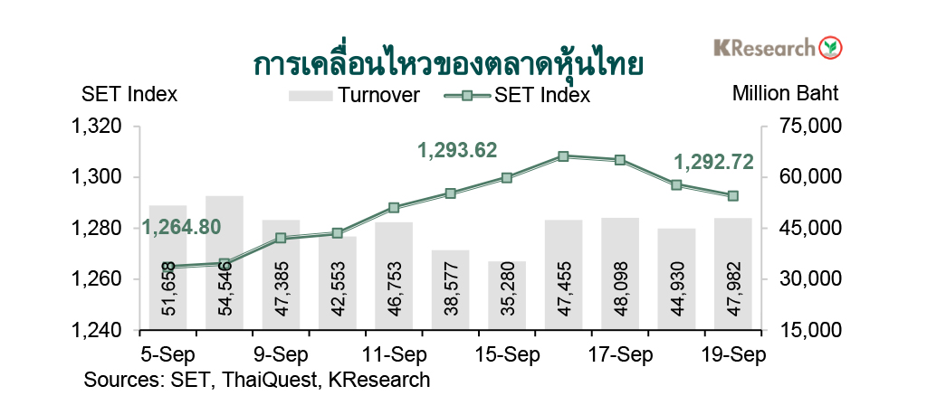 • สัปดาห์ถัดไป (22-26 ก.ย. 68) บริษัทหลักทรัพย์กสิกรไทย จำกัด มองว่า ดัชนีหุ้นไทยมีแนวรับที่ 1,275 และ 1,250 จุด ขณะที่แนวต้านอยู่ที่ 1,300 และ 1,315 จุด ตามลำดับ โดยศูนย์วิจัยกสิกรไทยประเมินปัจจัยสำคัญที่ต้องติดตาม ได้แก่ ตัวเลขส่งออกเดือนส.ค.ของไทย ถ้อยแถลงของเจ้าหน้าที่เฟด รวมถึงทิศทางเงินทุนต่างชาติ ส่วนข้อมูลเศรษฐกิจสหรัฐฯ ที่สำคัญ ได้แก่ ดัชนี PMI ภาคการผลิตและการบริการเดือนก.ย. (เบื้องต้น) ยอดสั่งซื้อสินค้าคงทน ยอดขายบ้านมือสอง รายได้และรายจ่ายส่วนบุคคล และดัชนี PCE/Core PCE Price Index เดือนส.ค. ตัวเลขจีดีพีไตรมาส 2/2568 รวมถึงจำนวนผู้ขอรับสวัสดิการว่างงานรายสัปดาห์ ขณะที่ปัจจัยเศรษฐกิจต่างประเทศอื่น ๆ ได้แก่ ดัชนี PMI ภาคการผลิตและการบริการเดือนก.ย. (เบื้องต้น) ของยูโรโซน อังกฤษ และญี่ปุ่น