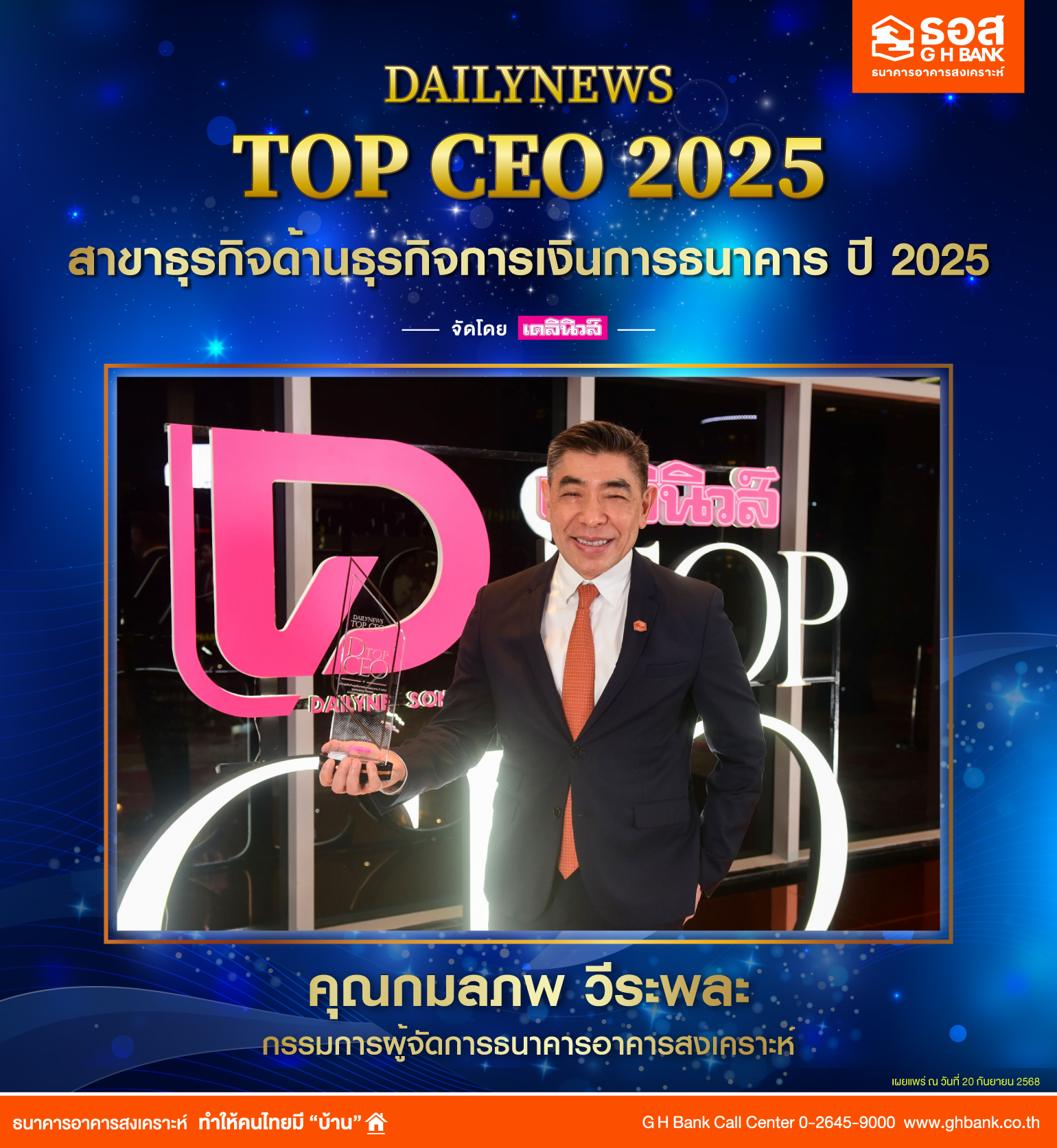 นายกมลภพ วีระพละ กรรมการผู้จัดการธนาคารอาคารสงเคราะห์ (ธอส.) รับรางวัลเกียรติยศ “DAILYNEWS TOP CEO 2025 สาขาธุรกิจด้านธุรกิจการเงินการธนาคาร ปี 2025” ซึ่งเดลินิวส์จัดขึ้นเพื่อยกย่องเชิดชูเกียรติให้กับผู้บริหารสูงสุดขององค์กรทั้งภาครัฐและเอกชน ที่มีความโดดเด่นในการบริหารจัดการด้านต่างๆ จนประสบความสำเร็จ ส่งผลให้เกิดประโยชน์ต่อภาพรวมทางเศรษฐกิจ สังคม และประเทศชาติ โดย ธอส. สามารถดำเนินตามพันธกิจ “ทำให้คนไทยมีบ้าน” มาแล้วมากกว่า 4.6 ล้านครอบครัว สะท้อนบทบาทผู้นำการปล่อยสินเชื่อที่อยู่อาศัยเพื่อกระตุ้นเศรษฐกิจผ่านภาคอสังหาริมทรัพย์มาอย่างต่อเนื่อง จากการปล่อยสินเชื่อบ้านปี 2567 จำนวน 236,547 ล้านบาท และล่าสุด 8 เดือนแรกของปี 2568 สามารถปล่อยสินเชื่อใหม่ได้แล้วกว่า 150,000 ล้านบาท อีกทั้งยังส่งเสริมวินัยการออมให้กับผู้มีรายได้น้อยได้มีโอกาสเข้าถึงสินเชื่อที่อยู่อาศัยผ่านโครงการ ธอส. โรงเรียนการเงิน ปัจจุบันมีผู้สนใจลงทะเบียนเพื่อเปิดบัญชีเงินออมกว่า 220,000 ราย และมีลูกค้าได้รับสินเชื่อจาก ธอส. มากกว่า 40,000 ราย คิดเป็นวงเงินกว่า 51,000 ล้านบาท นอกจากนี้ ตลอดระยะเวลาการดำเนินงาน ธอส. ยังดูแลลูกค้าที่ประสบปัญหาด้านรายได้ให้กลับมามีสถานะปกติ และรักษาบ้านของตนเองได้แล้วกว่า 1.2 ล้านครอบครัว ด้านเทคโนโลยี ธอส. ได้ยกระดับ GHB SYSTEM ให้มีเสถียรภาพและมีความต่อเนื่องในการให้บริการลูกค้า เพิ่มความรวดเร็วในการทำธุรกรรมและรองรับการเติบโตทางธุรกิจของธนาคารในอนาคต สอดคล้องกับเกณฑ์ของธนาคารแห่งประเทศไทย (ธปท.) ซึ่งรางวัลที่ได้รับในครั้งนี้เกิดขึ้นจากการร่วมมือร่วมใจของพนักงานทั้ง 5,000 คน ที่พร้อมมุ่งมั่นพัฒนาองค์กรเพื่อให้ ธอส. เติบโตอย่างยั่งยืนและยังคงเป็น “ธนาคารที่ดีที่สุดสำหรับการมีบ้าน” ของคนไทยต่อไป ทั้งนี้ การรับรางวัล DAILYNEWS TOP CEO 2025 จัดขึ้น ณ โรงแรมเซ็นทารา แกรนด์ แอท เซ็นทรัลเวิลด์ ถนนพระราม 1 แขวงปทุมวัน เขตปทุมวัน กรุงเทพมหานคร เมื่อวันที่ 19 กันยายน 2568