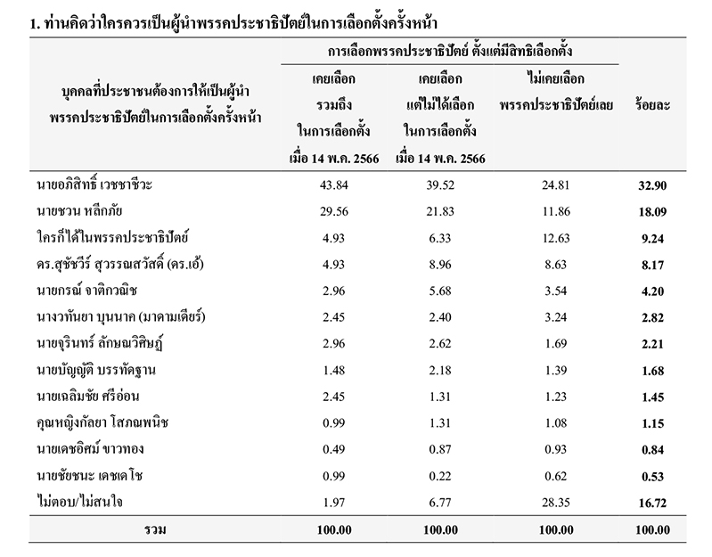 จากการสำรวจเมื่อถามถึงบุคคลที่ประชาชนต้องการให้เป็นผู้นำพรรคประชาธิปัตย์ในการเลือกตั้งครั้งหน้า พบว่า ตัวอย่าง ร้อยละ 32.90 ระบุว่าเป็น นายอภิสิทธิ์ เวชชาชีวะ รองลงมา ร้อยละ 18.09 ระบุว่าเป็น นายชวน หลีกภัย ร้อยละ 16.72 ระบุว่า ไม่ตอบ/ไม่สนใจ ร้อยละ 9.24 ระบุว่า ใครก็ได้ในพรรคประชาธิปัตย์ ร้อยละ 8.17 ระบุว่าเป็น ดร.สุชัชวีร์ สุวรรณสวัสดิ์ (ดร.เอ้) ร้อยละ 4.20 ระบุว่าเป็น นายกรณ์ จาติกวณิช ร้อยละ 2.82 ระบุว่าเป็น นางวทันยา บุนนาค (มาดามเดียร์) ร้อยละ 2.21 ระบุว่าเป็น นายจุรินทร์ ลักษณวิศิษฏ์ ร้อยละ 1.68 ระบุว่าเป็น นายบัญญัติ บรรทัดฐาน ร้อยละ 1.45 ระบุว่าเป็น นายเฉลิมชัย ศรีอ่อน ร้อยละ 1.15 ระบุว่าเป็น คุณหญิงกัลยา โสภณพนิช ร้อยละ 0.84 ระบุว่าเป็น นายเดชอิศม์ ขาวทอง และร้อยละ 0.53 ระบุว่าเป็น นายชัยชนะ เดชเดโช