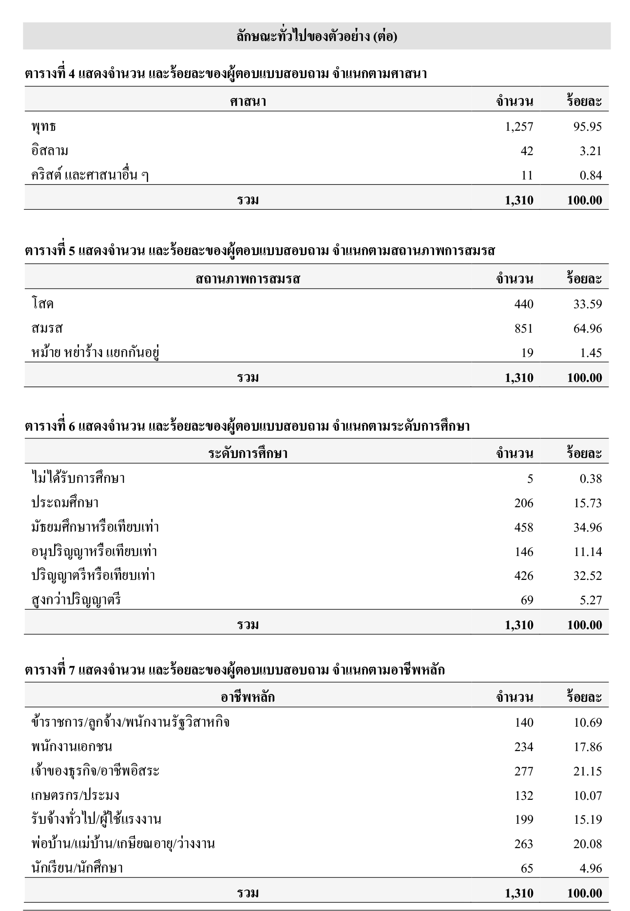 ตัวอย่าง ร้อยละ 12.13 อายุ 18-25 ปี ร้อยละ 17.79 อายุ 26-35 ปี ร้อยละ 17.94 อายุ 36-45 ปี ร้อยละ 26.34 อายุ 46-59 ปี และร้อยละ 25.80 อายุ 60 ปีขึ้นไป โดยตัวอย่าง ร้อยละ 95.95 นับถือศาสนาพุทธ ร้อยละ 3.21 นับถือศาสนาอิสลาม และร้อยละ 0.84 นับถือศาสนาคริสต์ และศาสนาอื่น ๆ