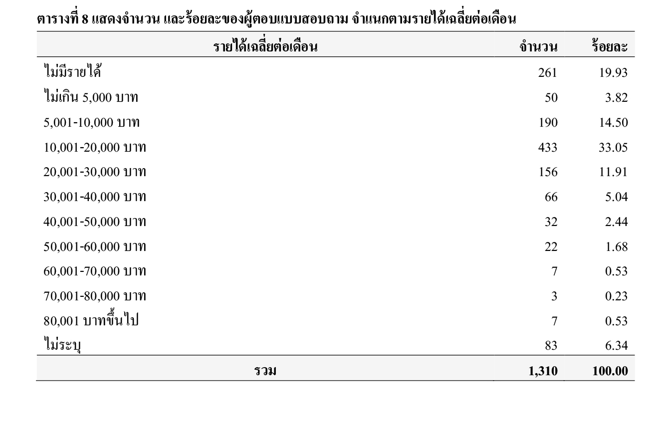 ตัวอย่าง ร้อยละ 19.93 ไม่มีรายได้ ร้อยละ 3.82 รายได้เฉลี่ยต่อเดือนไม่เกิน 5,000 บาท ร้อยละ 14.50 รายได้เฉลี่ยต่อเดือน 5,001-10,000 บาท ร้อยละ 33.05 รายได้เฉลี่ยต่อเดือน 10,001-20,000 บาท ร้อยละ 11.91 รายได้เฉลี่ยต่อเดือน 20,001-30,000 บาท ร้อยละ 5.04 รายได้เฉลี่ยต่อเดือน 30,001-40,000 บาท ร้อยละ 2.44 รายได้เฉลี่ยต่อเดือน 40,001-50,000 บาท ร้อยละ 1.68 รายได้เฉลี่ยต่อเดือน 50,001-60,000 บาท ร้อยละ 0.53 รายได้เฉลี่ยต่อเดือน 60,001-70,000 บาท และรายได้เฉลี่ยต่อเดือน 80,001 บาทขึ้นไป ในสัดส่วนที่เท่ากัน ร้อยละ 0.23 รายได้เฉลี่ยต่อเดือน 70,001-80,000 บาท และร้อยละ 6.34 ไม่ระบุรายได้