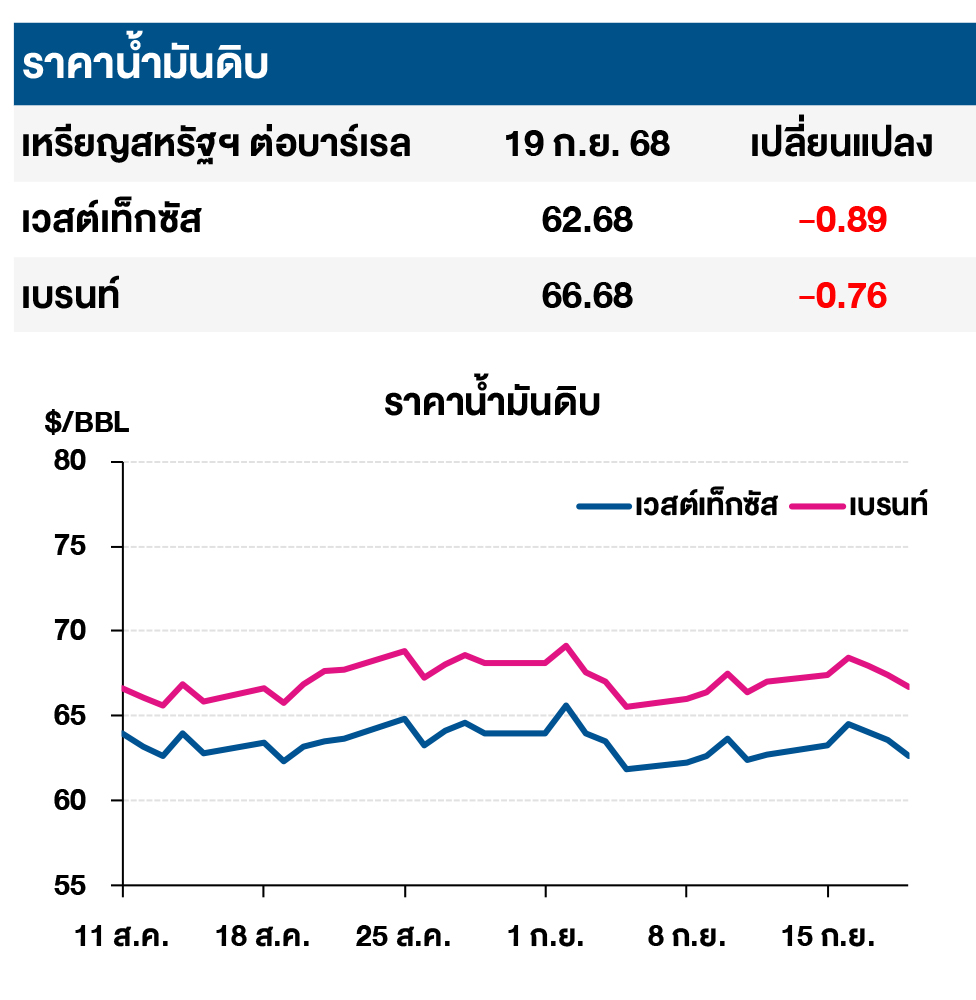 (-) Baker Hughes เผยจํานวนแท่นขุดเจาะนํ้ามันดิบสหรัฐฯ ประจำสัปดาห์สิ้นสุด ณ วันที่ 19 ก.ย. 68 ปรับเพิ่ม 2 แท่นจากสัปดาห์ก่อน อยู่ที่ระดับ 418 แท่น ขณะที่แท่นขุดเจาะก๊าซธรรมชาติไม่เปลี่ยนแปลงอยู่ที่ระดับ 118 แท่น