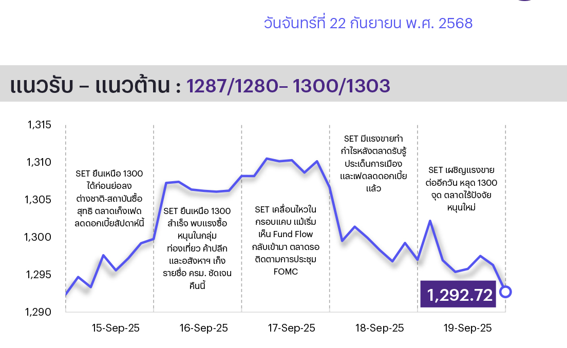 คาดตลาดแกว่งไซด์เวย์ นักลงทุนต่างชาติยังคงขายสุทธิสูงพร้อมกับค่าเงินบาทที่มีช่วงอ่อนค่า เป็นสัญญาณกดดันจิตวิทยาต่อตลาด อย่างไรก็ตาม ตลาดติดตามนโยบายกระตุ้นเศรษฐกิจที่คาดว่าจะทยอยมีรายละเอียดออกมาซึ่งจะเป็นปัจจัยหนุน โดย ครม. จะเข้าถวายสัตย์วันที่ 24 ก.ย.นี้ และคาดว่าจะมีการแถลงต่อสภาฯ วันถัดไป ทางเทคนิค ยังคงให้ดูที่แนวต้าน 1300/1303 ยืนเหนือได้กลับเป็นขึ้น หากยืนไม่ได้คาดยังพักตัวต่อมีแนวรับอยู่ที่ 1287/1280 ที่จะทำให้มีช่วงดีดกลับได้