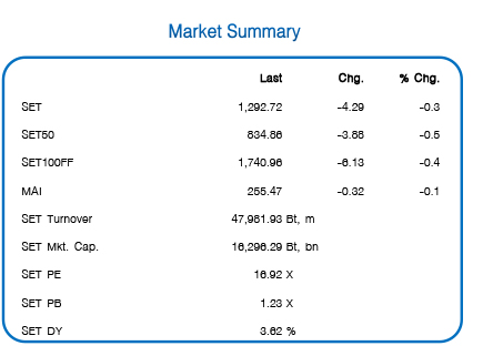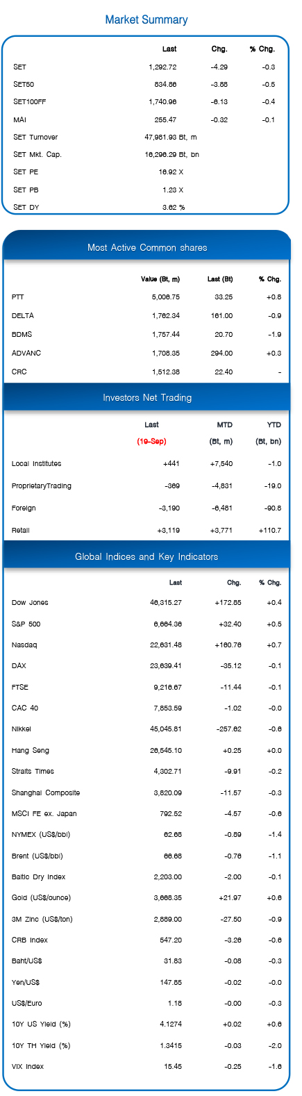 FTSE Rebalancing – SET แกว่งสร้างฐาน +/- ในกรอบ 1292-1309 มูลค่าซื้อขายหนาแน่น 4.79 หมื่นลบ. แม้ครม.ชุดใหม่ได้รับการโปรดเกล้าฯ แล้ว แต่ราคาหุ้นตอบรับไปแล้วก่อนหน้านี้ และมีแรงขายปรับพอร์ตจาก FTSE Rebalancing ในช่วงท้ายตลาด ต่างชาติขายสุทธิ 3.19 พันลบ. 3 วันติด แต่พลิก Long S50 Futures 2,745 สัญญา