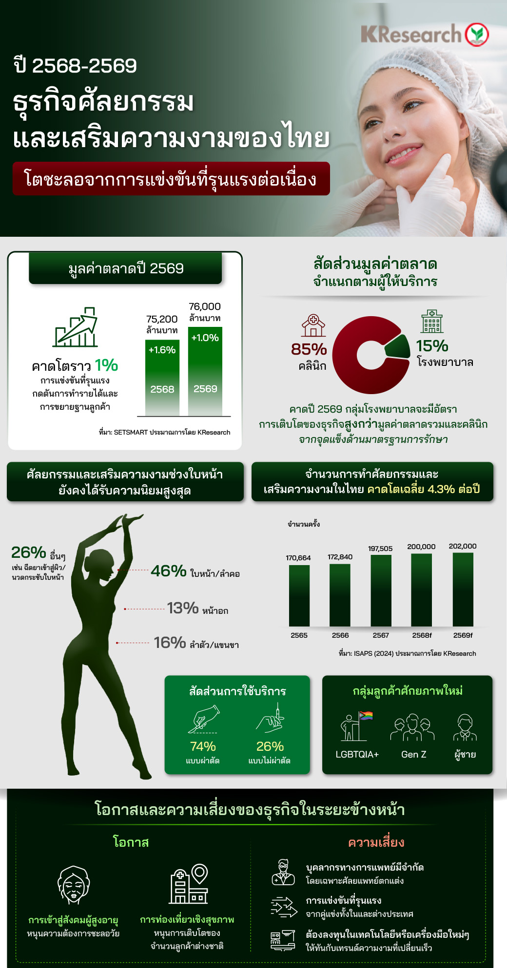 ปัจจุบันคนรุ่นใหม่เปิดกว้างและกล้าทำศัลยกรรมมากขึ้น ส่วนหนึ่งมาจากเทคโนโลยีการรักษาที่ทันสมัย มีความปลอดภัยและใช้เวลาฟื้นตัวน้อยลง ขณะที่หัตถการความงามบางประเภท สามารถให้ผลลัพธ์ที่ใกล้เคียงการผ่าตัดได้ ส่งผลให้การทำศัลยกรรมและเสริมความงามแบบไม่ผ่าตัด ได้รับความนิยมมากขึ้น สะท้อนจาก ปี 2567 สัดส่วนการทำศัลยกรรมแบบผ่าตัดอยู่ที่ 74% ลดลงจากปี 2566 ที่ 79% ขณะที่การทำศัลยกรรมแบบไม่ผ่าตัด มีสัดส่วนขยับขึ้นมาอยู่ที่ 26%