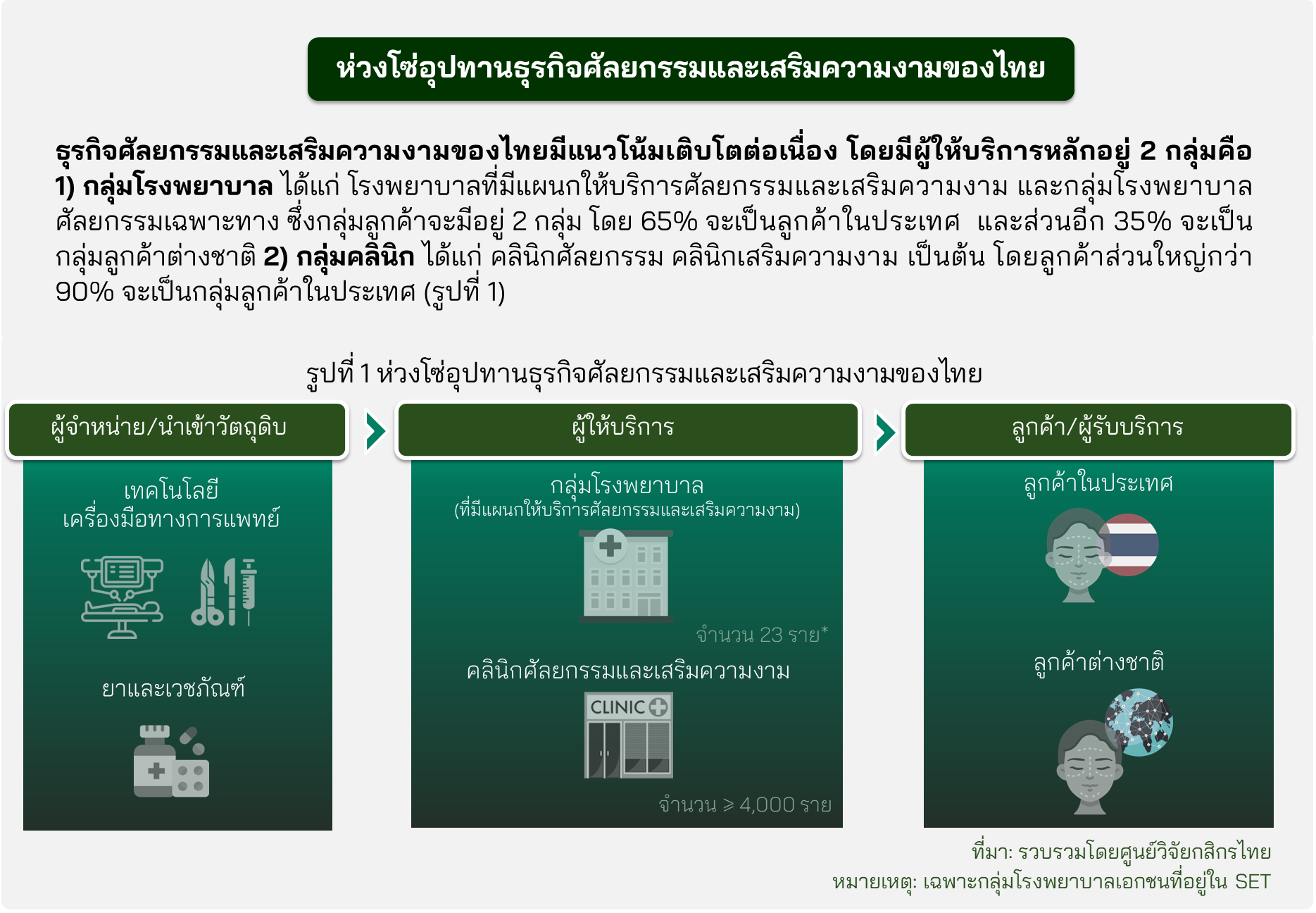 • ท่องเที่ยวเชิงสุขภาพหนุนการเติบโตของจำนวนลูกค้าต่างชาติ สอดคล้องกับจำนวนลูกค้า Medical Tourism ของไทย ที่คาดว่าจะเพิ่มขึ้นเฉลี่ยปีละ 5% ทั้งนี้ ศัลยกรรมความงามอยู่ในกลุ่มบริการทางการแพทย์ที่ชาวต่างชาตินิยมเข้ามาใช้บริการในไทยมากเป็นอันดับ 2 โดยมีลูกค้าหลัก คือ จีน มาเลเซีย ญี่ปุ่น รวมถึงอินโดนีเซีย ที่ได้รับอิทธิพลจากกระแส K-Pop และการเปิดกว้างกับการทำศัลยกรรมมากขึ้น