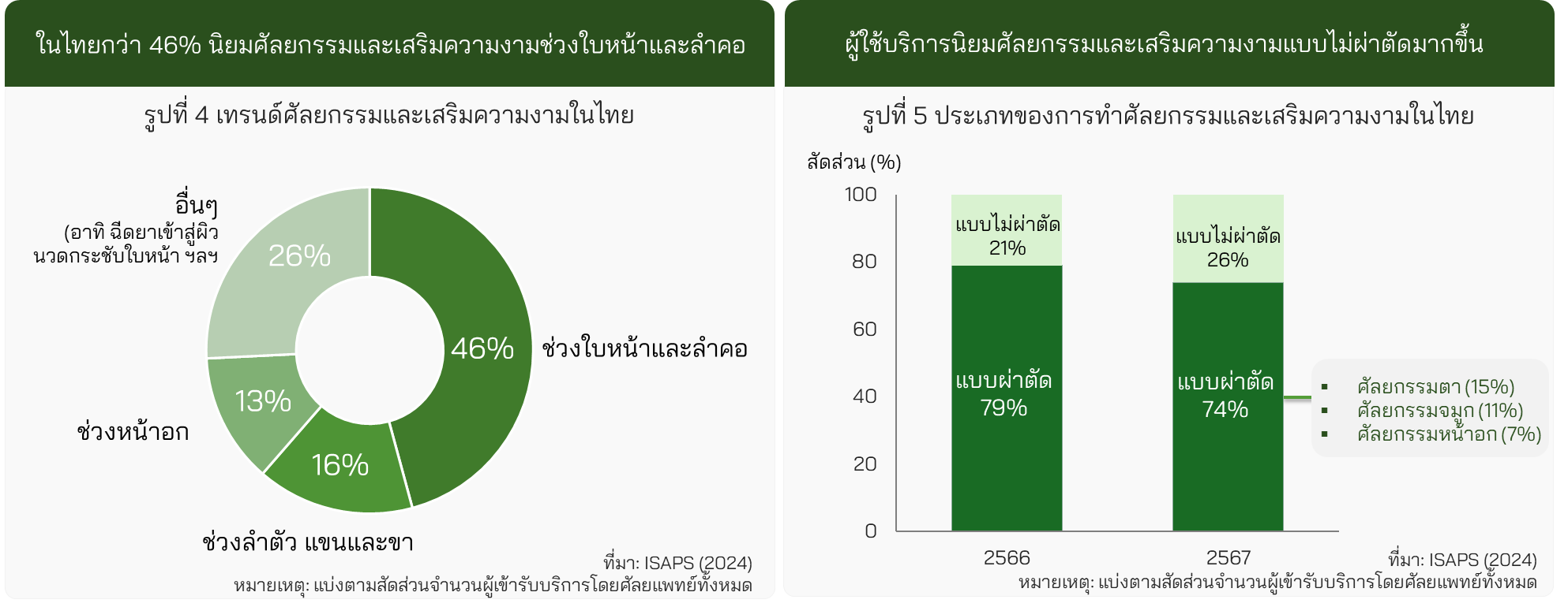 การทำศัลยกรรมโดยศัลยแพทย์ในไทยกว่า 74% ของจำนวนการใช้บริการ เป็นแบบผ่าตัด ส่วนอีก 26% เป็นแบบไม่ผ่าตัด แม้จะมีสัดส่วนน้อยกว่าแต่ก็ได้รับความนิยมเพิ่มขึ้น (รูปที่ 5)