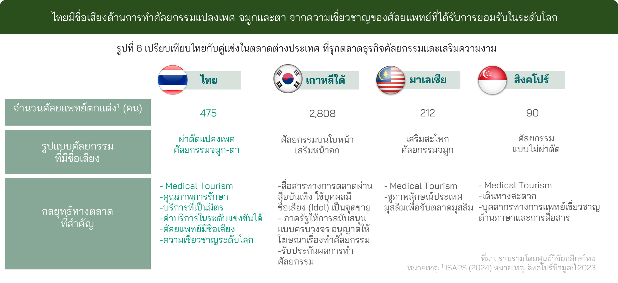 • บุคลากรทางการแพทย์มีจำกัดโดยเฉพาะศัลยแพทย์ตกแต่ง ซึ่งในไทยมีเพียง 475 ราย (รูปที่ 6) เมื่อเทียบกับคู่แข่งสำคัญอย่าง เกาหลีใต้ ซึ่งมีอยู่ 2,808 ราย ทำให้อัตราการแข่งขันเพื่อแย่งบุคลากรทางการแพทย์สูงและส่งผลให้ต้นทุนธุรกิจสูงขึ้น เช่น ในกรณีของศัลยแพทย์ตกแต่งใบหน้าในไทยที่มีเพียง 100 คน